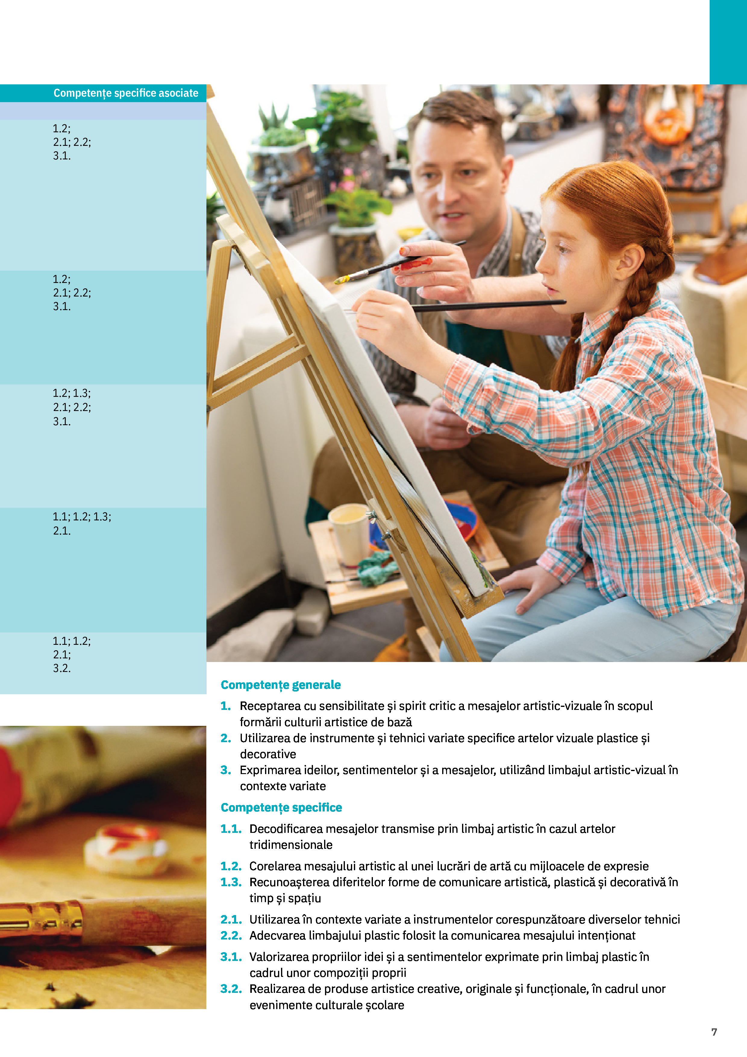 · Înțelegerea de ansamblu îl va ajuta pe elev să emită judecăți de valoare legate de domeniul artelor vizuale, oferind, totodată, o perspectivă mai amplă asupra altor discipline și asupra vieții de zi cu zi. Conține metode de inițiere în realizarea unor produse artistice sau de aprofundare a înțelegerii mesajelor vizuale pe care le transmit operele de artă.