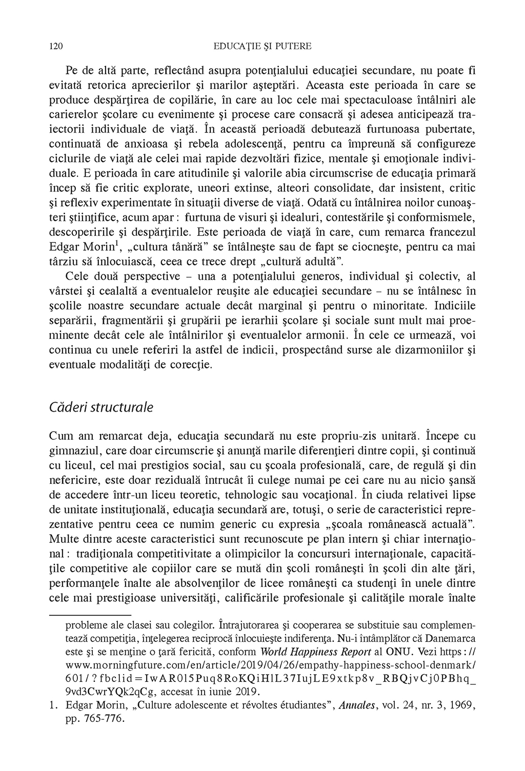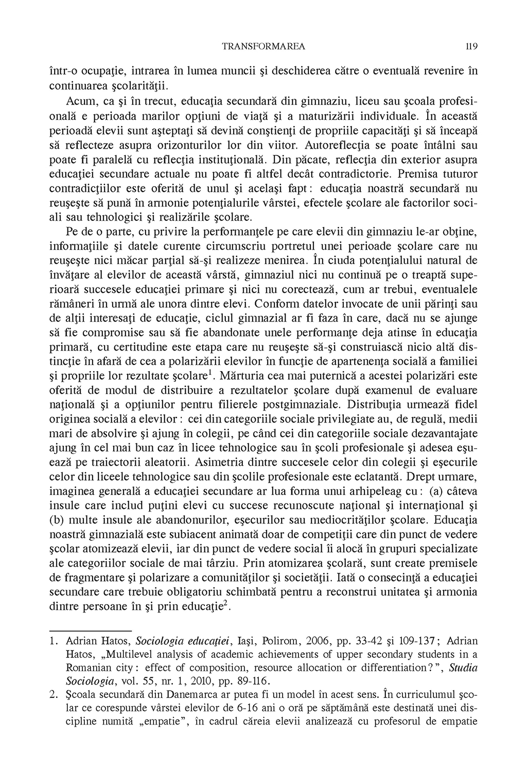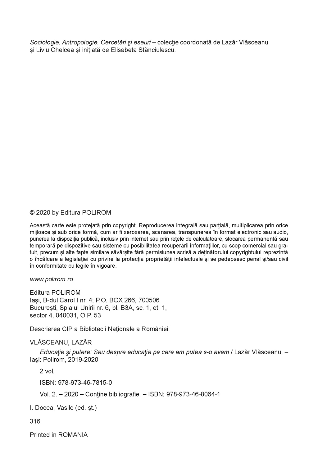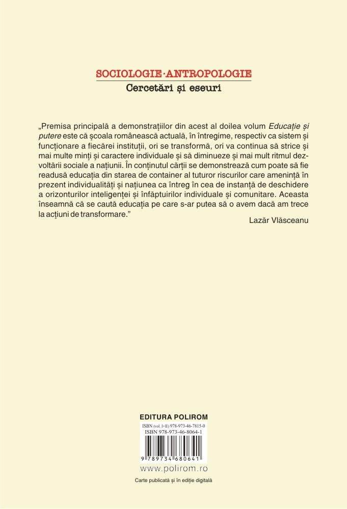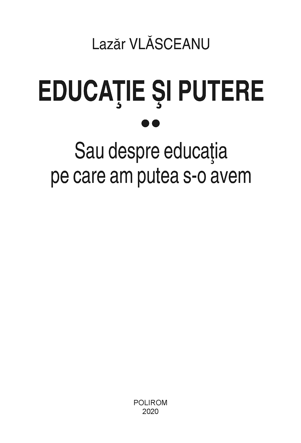 „Premisa principală a demonstraţiilor din acest al doilea volum Educaţie şi putere este că şcoala românească actuală, în întregime, respectiv ca sistem şi funcţionare a fiecărei instituţii, ori se transformă, ori va continua să strice şi mai multe minţi şi caractere individuale şi să diminueze şi mai mult ritmul dezvoltării sociale a naţiunii. În conţinutul cărţii se demonstrează cum poate să fie readusă educaţia din starea de container al tuturor riscurilor care ameninţă în prezent individualităţi şi naţiunea ca întreg în cea de instanţă de deschidere a orizonturilor inteligenţei şi înfăptuirilor individuale şi comunitare. Aceasta înseamnă că se caută educaţia pe care s-ar putea să o avem dacă am trece la acţiuni de transformare.” (Lazăr Vlăsceanu)