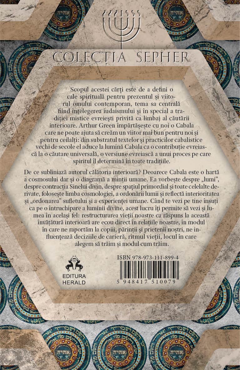 Scopul acestei carti este de a defini o cale spirituala pentru prezentul si viitorul omului contemporan, tema sa centrala fiind intelegerea iudaismului si in special a traditiei mistice evreiesti privita ca limbaj al cautarii interioare. Arthur Green impartaseste cu noi o Cabala care ne poate ajuta sa cream un viitor mai bun pentru noi si pentru ceilalti: din substratul textelor si practicilor cabalistice vechi de secole el aduce la lumina Cabala ca o contributie evreiasca la o cautare universala, o versiune evreiasca a unui proces pe care spiritul il determina in toate traditiile.