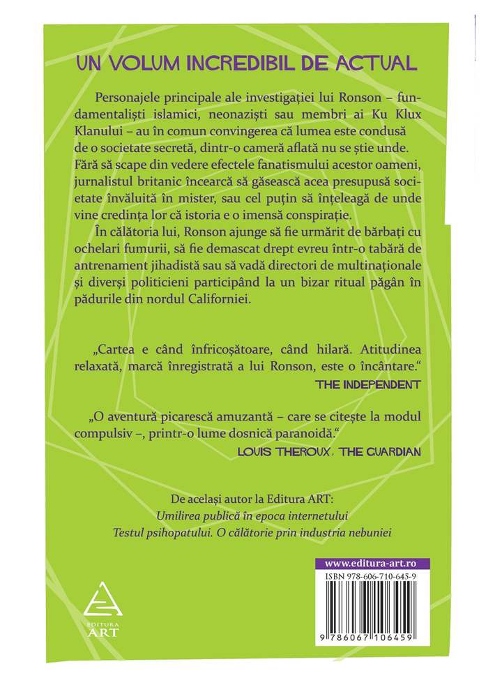 Personajele principale ale investigației lui Ronson - fundamentaliști islamici, neonaziști sau membri ai Ku Klux Klanului - au în comun convingerea că lumea este condusă de o societate secretă, dintr-o cameră aflată nu se știe unde. Fără să scape din vedere efectele fanatismului acestor oameni, jurnalistul britanic încearcă să găsească acea presupusă societate învăluită în mister, sau cel puțin să înțeleagă de unde vine credința lor că istoria e o imensă conspirație.