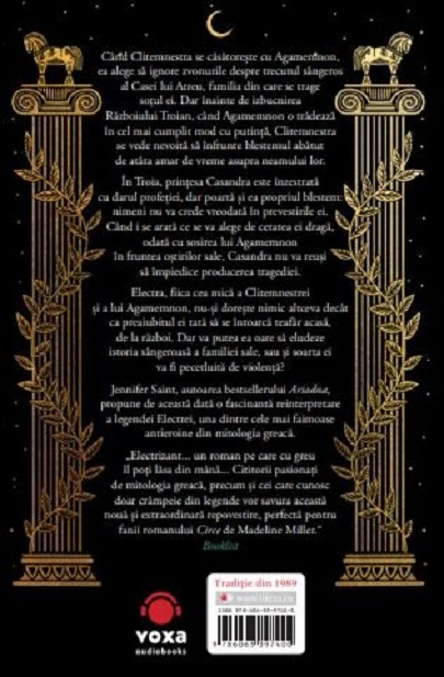 Jennifer Saint, autoarea bestsellerului Ariadna, propune de această dată o fascinantă reinterpretare a legendei Electrei, una dintre cele mai faimoase antieroine din mitologia greacă.