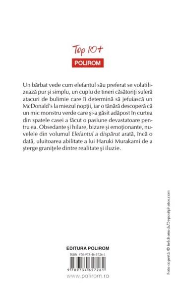 Un barbat vede cum elefantul sau preferat se volatilizeaza pur si simplu, un cuplu de tineri casatoriti sufera atacuri de bulimie care ii determina sa jefuiasca un McDonald’s la miezul noptii, iar o tinara descopera ca un mic monstru verde care si-a gasit adapost in curtea din spatele casei a facut o pasiune devastatoare pentru ea. Obsedante si hilare, bizare si emotionante, nuvelele din volumul Elefantul a disparut arata, inca o data, uluitoarea abilitate a lui Haruki Murakami de a sterge granitele dintre realitate si iluzie.