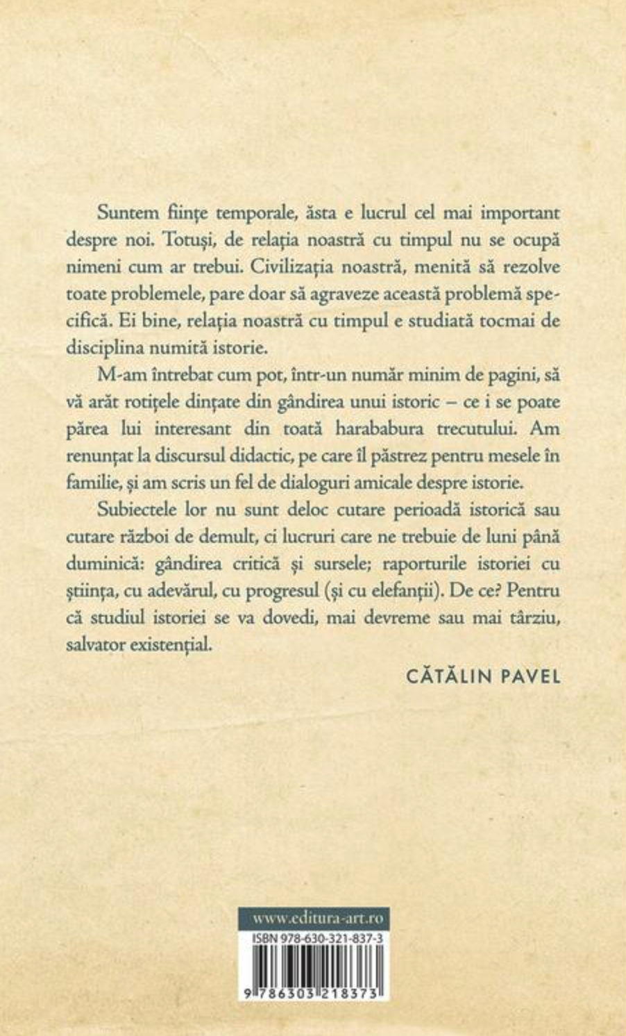 Atunci lectura cărții lui Cătălin Pavel este cum nu se poate mai nimerită, pentru că ea va răsturna și va nuanța considerabil tot ce știați despre această știință (surse, gândire critică, timp, cauzalitate, progres, adevăr, patrimoniu etc.), conferind istoriei un suflu nou, proaspăt și cool.