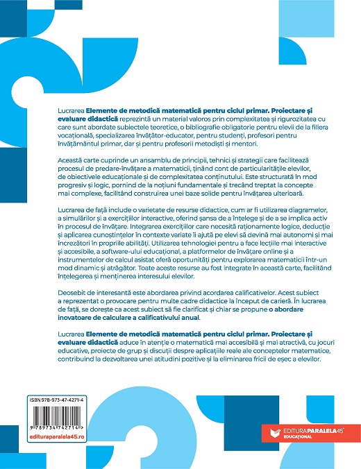 Lucrarea Elemente de metodică matematică pentru ciclul primar. Proiectare și evaluare didactică aduce în atenție o matematică mai accesibilă și mai atractivă, cu jocuri educative, proiecte de grup și discuții despre aplicațiile reale ale conceptelor matematice, contribuind la dezvoltarea unei atitudini pozitive și la eliminarea fricii de eșec a elevilor.