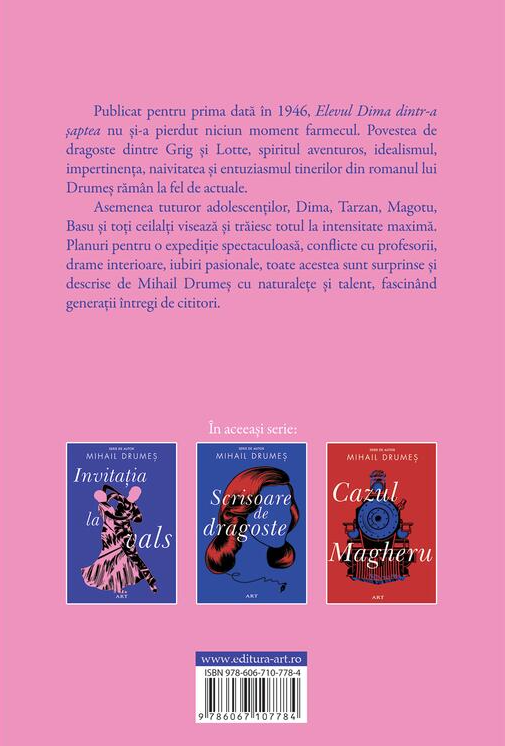 Publicat pentru prima dată în 1946, Elevul Dima dintr-a șaptea nu și-a pierdut niciun moment farmecul. Povestea de dragoste dintre Grig și Lotte, spiritul aventuros, idealismul, impertinența, naivitatea și entuziasmul tinerilor din romanul lui Drumeș rămân la fel de actuale.