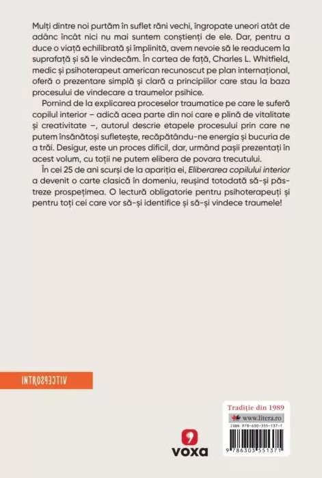 În cartea de față, Charles L. Whitfield, medic și psihoterapeut american recunoscut pe plan internațional, oferă o prezentare simplă și clară a principiilor care stau la baza procesului de vindecare a traumelor psihice.