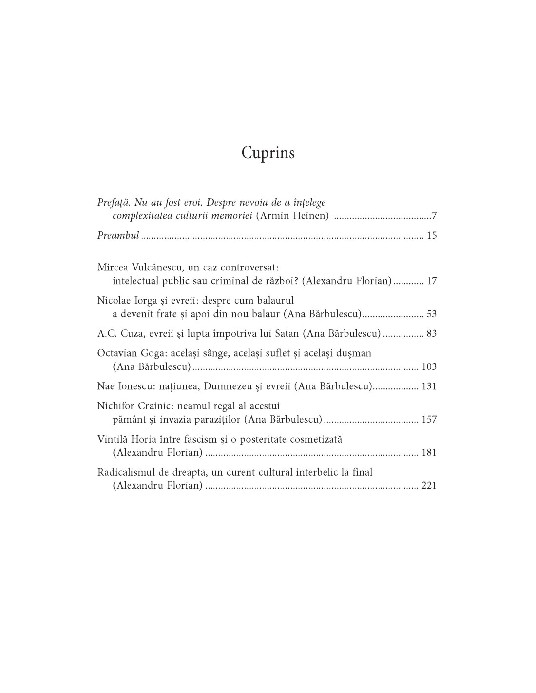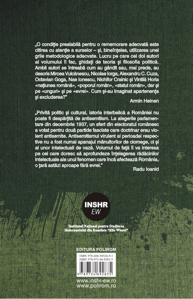 „Privită politic și cultural, istoria interbelică a României nu poate fi despărțită de antisemitism. La alegerile parlamentare din decembrie 1937, un sfert din electoratul românesc a votat pentru două partide fasciste care doctrinar erau violent antisemite. Antisemitismul virulent al perioadei respective nu a fost numai apanajul mânuitorilor de ciomege, ci și al unor intelectuali de vază. Volumul de față îi va interesa pe cei care doresc să aprofundeze înțelegerea rădăcinilor intelectuale ale unui fenomen care încă afectează România, o țară astăzi aproape fără evrei.” (Radu Ioanid)