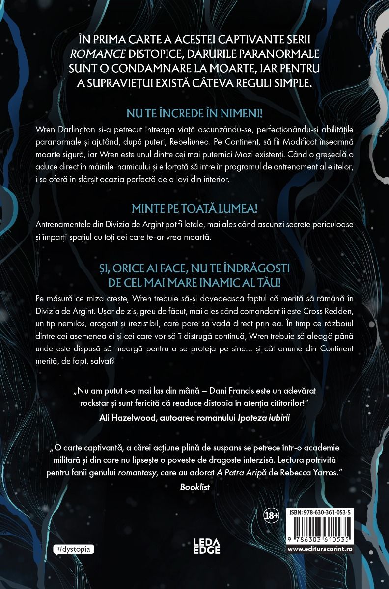 Pe măsură ce miza crește în acest thriller new adult, Wren trebuie să-și dovedească faptul că merită să rămână în Divizia de Argint. Ușor de zis, greu de făcut, mai ales când comandant îi este Cross Redden, un tip nemilos, arogant și irezistibil, care pare să vadă direct prin ea. În timp ce războiul dintre cei asemenea ei și cei care vor să îi distrugă continuă, Wren trebuie să aleagă până unde este dispusă să meargă pentru a se proteja pe sine… și cât anume din Continent merită, de fapt, salvat?