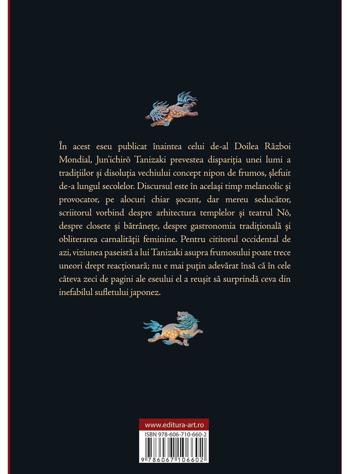 În acest eseu publicat înaintea celui de-al Doilea Război Mondial, Jun'ichirō Tanizaki prevestea dispariția unei lumi a tradițiilor și disoluția vechiului concept nipon de frumos, șlefuit de-a lungul secolelor. Discursul este în același timp melancolic și provocator, pe alocuri chiar șocant, dar mereu seducător, scriitorul vorbind despre arhitectura templelor și teatrul Nō, despre closete și bătrânețe, despre gastronomia tradițională și obliterarea carnalității feminine. Pentru cititorul occidental de azi, viziunea paseistă a lui Tanizaki asupra frumosului poate trece uneori drept reacționară; nu e mai puțin adevărat însă că în cele câteva zeci de pagini ale eseului el a reușit să surprindă ceva din inefabilul sufletului japonez.