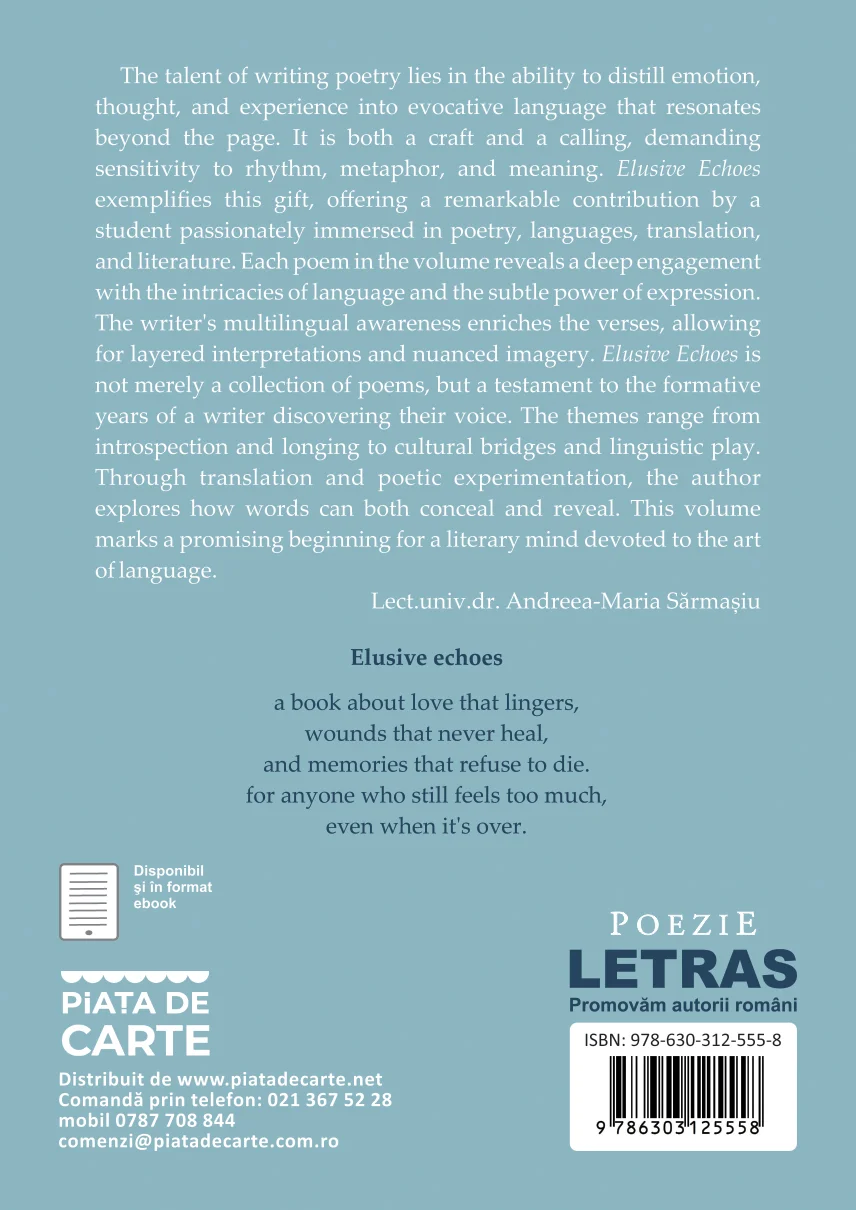 The talent of writing poetry lies in the ability to distill emotion, thought, and experience into evocative language that resonates beyond the page. It is both a craft and a calling, demanding sensitivity to rhythm, metaphor, and meaning. Elusive Echoes exemplifies this gift, offering a remarkable contribution by a student passionately immersed in poetry, languages, translation, and literature. Each poem in the volume reveals a deep engagement with the intricacies of language and the subtle power of expression. The writer’s multilingual awareness enriches the verses, allowing for layered interpretations and nuanced imagery. Elusive Echoes is not merely a collection of poems, but a testament to the formative years of a writer discovering their voice. The themes range from introspection and longing to cultural bridges and linguistic play. Through translation and poetic experimentation, the author explores how words can both conceal and reveal. This volume marks a promising beginning for a literary mind devoted to the art of language. Lect. Univ. Dr. Andreea-Maria Sarmasiu