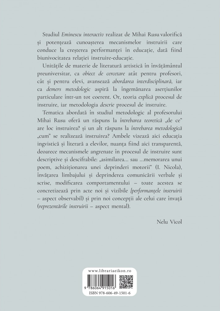 Studiul Eminescu interactiv realizat de Mihai Rusu valorifică și potențează cunoașterea mecanismelor instruirii care conduce la creșterea performanței în educație, dată fiind biunivocitatea relației instruire-educație. Unitățile de materie de literatură artistică în învățământul preuniversitar, ca obiect de cercetare atât pentru profesori, cât și pentru elevi, avansează abordarea interdisciplinară, iar ca demers metodologic aspiră la îngemănarea aserțiunilor particulare într-un tot coerent. Or, teoria explică procesul de instruire, iar metodologia descrie procesul de instruire. Tematica abordată în studiul metodologic al profesorului Mihai Rusu oferă un răspuns la întrebarea teoretică „de ce” are loc instruirea? și un alt răspuns la întrebarea metodologică „cum” se realizează instruirea? Ambele vizează aici educația lingvistică și literară a elevilor, nuanța fiind aici transparentă, deoarece mecanismele angrenate în procesul de instruire sunt descriptive și descifrabile: „asimilarea... sau ...memorarea unui poem, achiziționarea unei deprinderi motorii” (I. Nicola), învățarea limbajului și deprinderea comunicării verbale și scrise, modificarea comportamentului – toate acestea se concretizează prin acte noi și vizibile [performanțele instruirii – aspect observabil) și prin noi concepții ale celui care învață (reprezentările instruirii – aspect mental). - Nelu Vicol