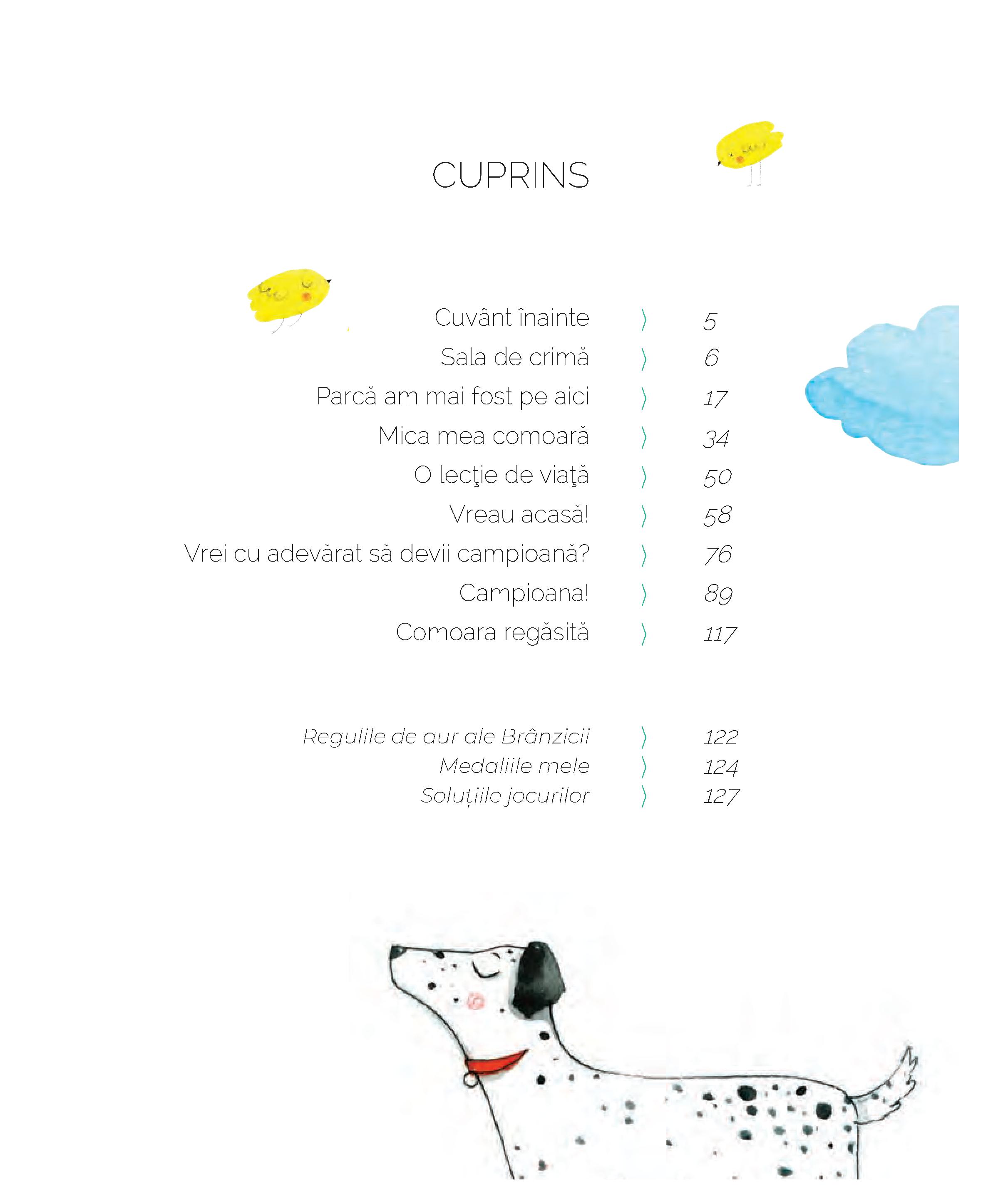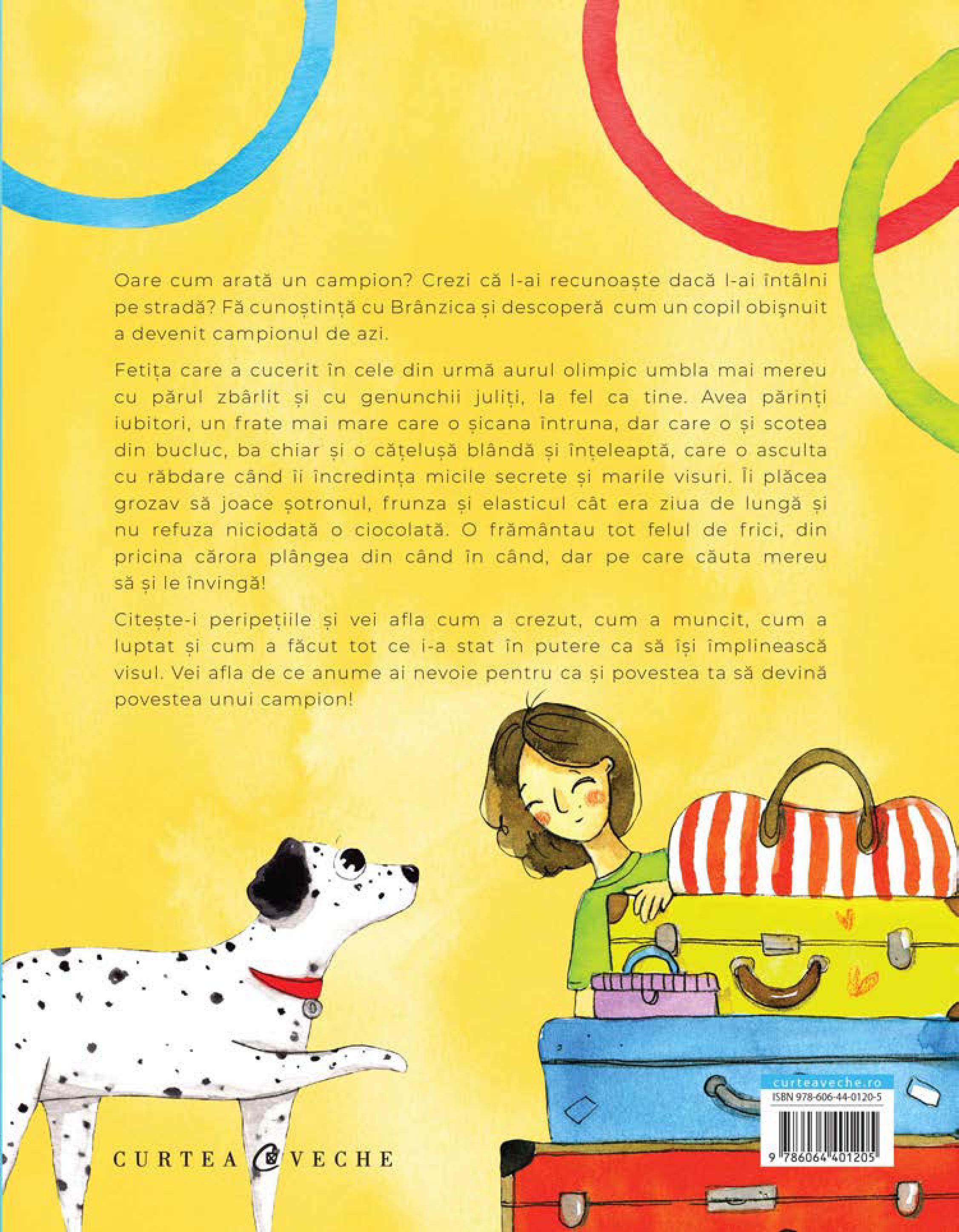 Fetița care a cucerit în cele din urmă aurul olimpic umbla mai mereu cu părul zbârlit și cu genunchii juliți, la fel ca tine. Avea părinți iubitori, un frate mai mare care o șicana întruna, dar care o și scotea din bucluc, ba chiar și o cățelușă blândă și înțeleaptă, care o asculta cu răbdare când îi încredința micile secrete și marile visuri. Îi plăcea grozav să joace șotronul, frunza și elasticul cât era ziua de lungă și nu refuza niciodată o ciocolată. O frământau tot felul de frici, din pricina cărora plângea din când în când, dar pe care căuta mereu să și le învingă!
