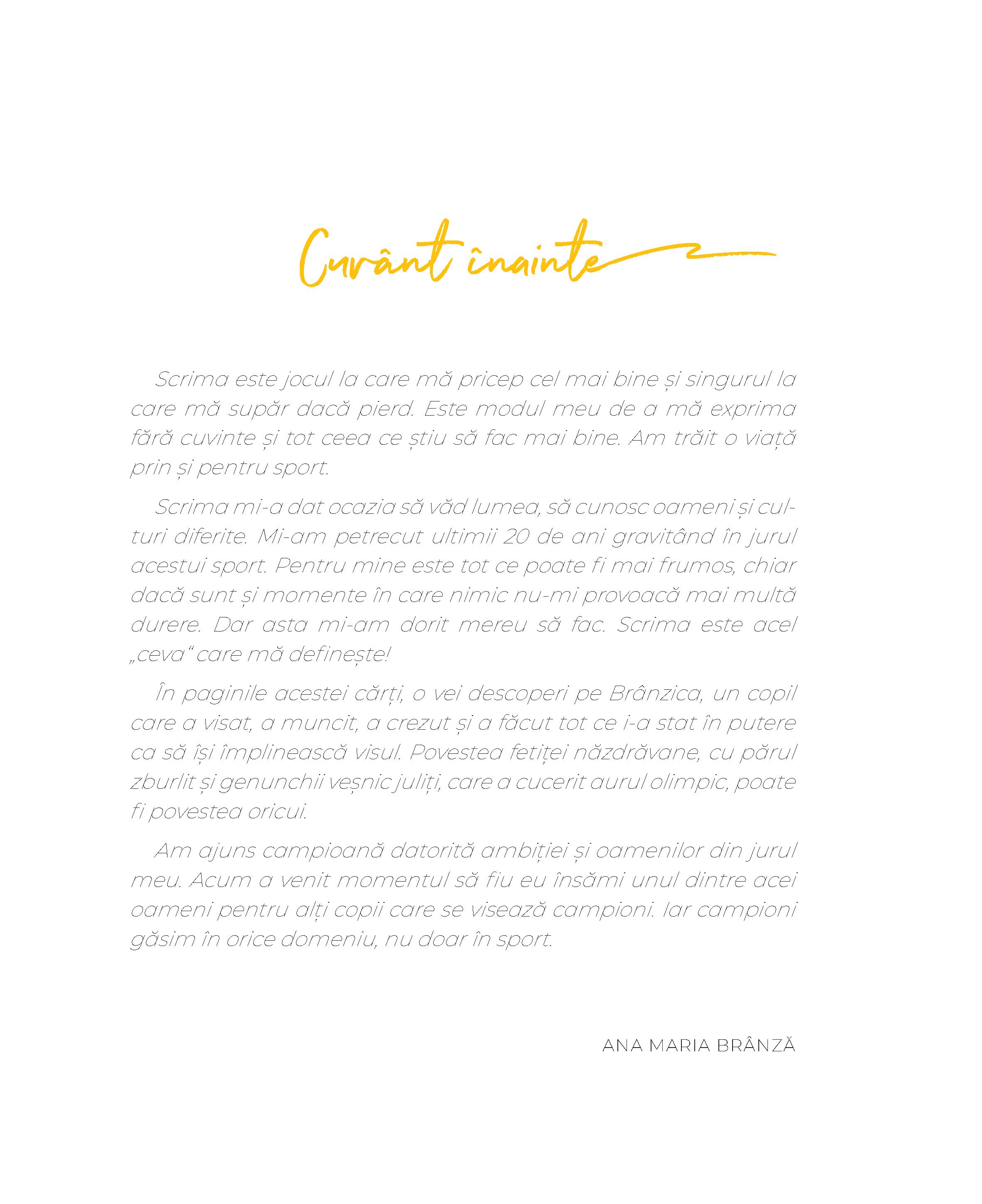 Ana Maria Brânză este unul dintre cei mai îndrăgiți ambasadori ai sportului românesc peste hotare. În copilărie, când era pur și simplu „Brânzica“, a descoperit din întâmplare, cu ajutorul fratelui ei, un sport nobil: scrima. I s-a dedicat cu pasiune și a făcut din el o carieră și un rost în viață, ajungând de-a lungul anilor cam¬pioană națională, europeană, mondială și olimpică. Ana Maria ar vrea să fie un model pentru toți copiii care își doresc să izbândească într-un domeniu, oricare ar fi el, și crede din toată inima că povestea fetiței năzdrăvane, care s-a luptat până când a cucerit aurul olimpic la spadă, poate fi povestea oricărui prichindel ambițios și cu poftă de joacă. Cine știe, poate chiar a ta?!
