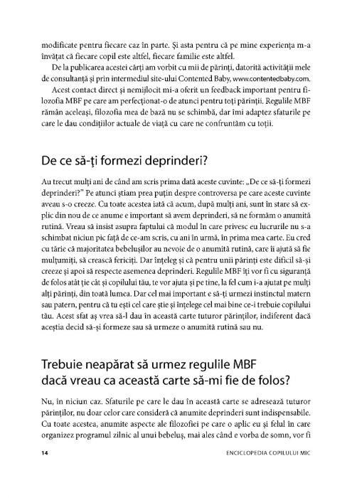 Organizată în capitole împărţite pe vârste şi subîmpărţită în categoriile „hrană” şi „somn”, pentru a identifica mai uşor situaţiile dificile, şi conţi­nând studii de caz expuse în detaliu, cartea scrisă de Gina Ford te va ajuta să găseşti soluţii practice, uşoare, realiste şi de încredere pentru majoritatea problemelor pe care le poate avea un bebeluş sau un copil mic.