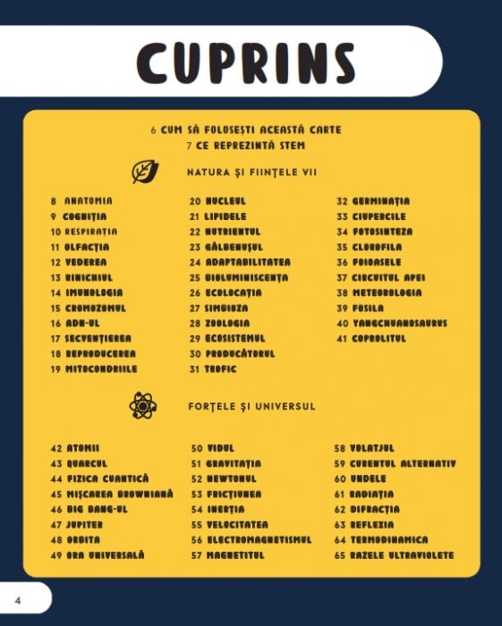 În Enciclopedia STEM, veţi descoperi o grămadă de cuvinte care mai de care mai interesante. Fiecare termen din cartea de față este deosebit de inspirat ilustrat, cu mult umor și farmec, iar cele 100 de concepte esențiale prezentate îi vor fascina, cu siguranță, pe tinerii cititori cu înclinaţii științifice: de la anatomia corpului uman, ecolocație și circuitul apei în natură până la Razele X, Wi-Fi, terifiantul Yangchuanosaurus și chiar până la adevărata definiție a lui Zero! În cuprinsul cărţii, veți mai găsi, de asemenea, o mulțime de cuvinte și de definiții suplimentare… plus numeroase fapte uluitoare.