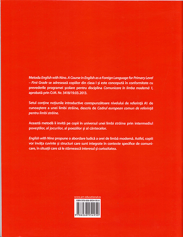 Metoda English with Nino. A course in English as a Foreign Language for Primary Level - First Grade se adreseaza copiilor din clasa I si este conceputa in conformitate cu prevederile programei scolare pentru disciplina Comunicare in limba moderna 1, aprobaba prin O.M. Nr. 3418/19.03.2013.