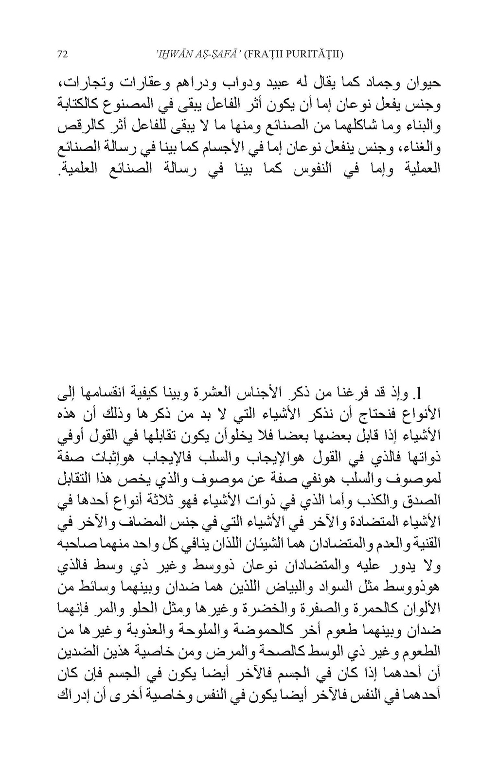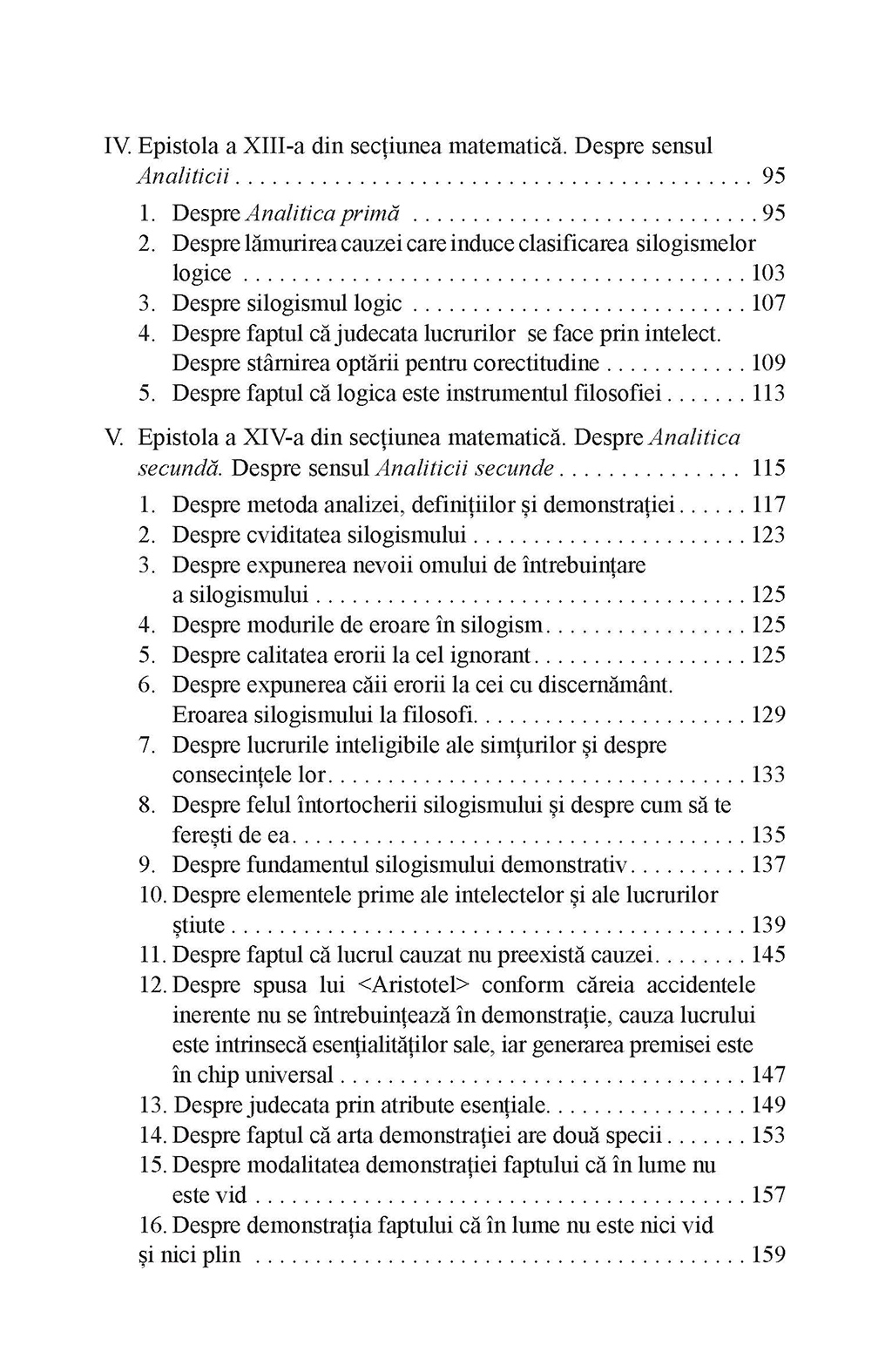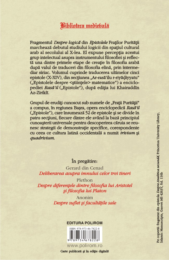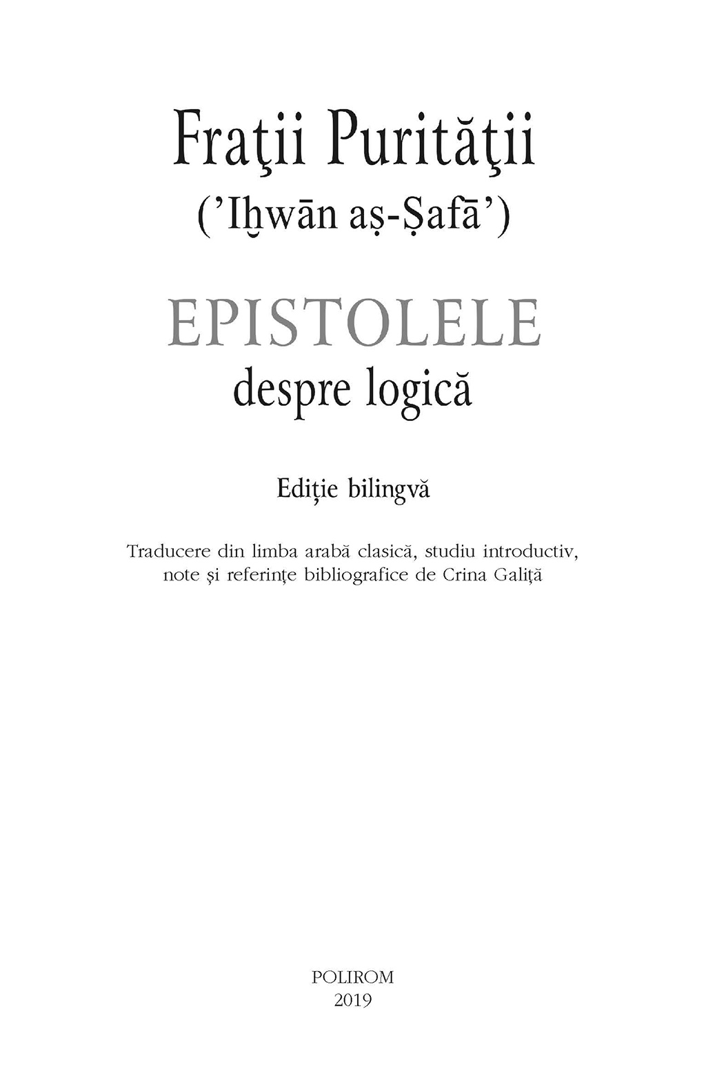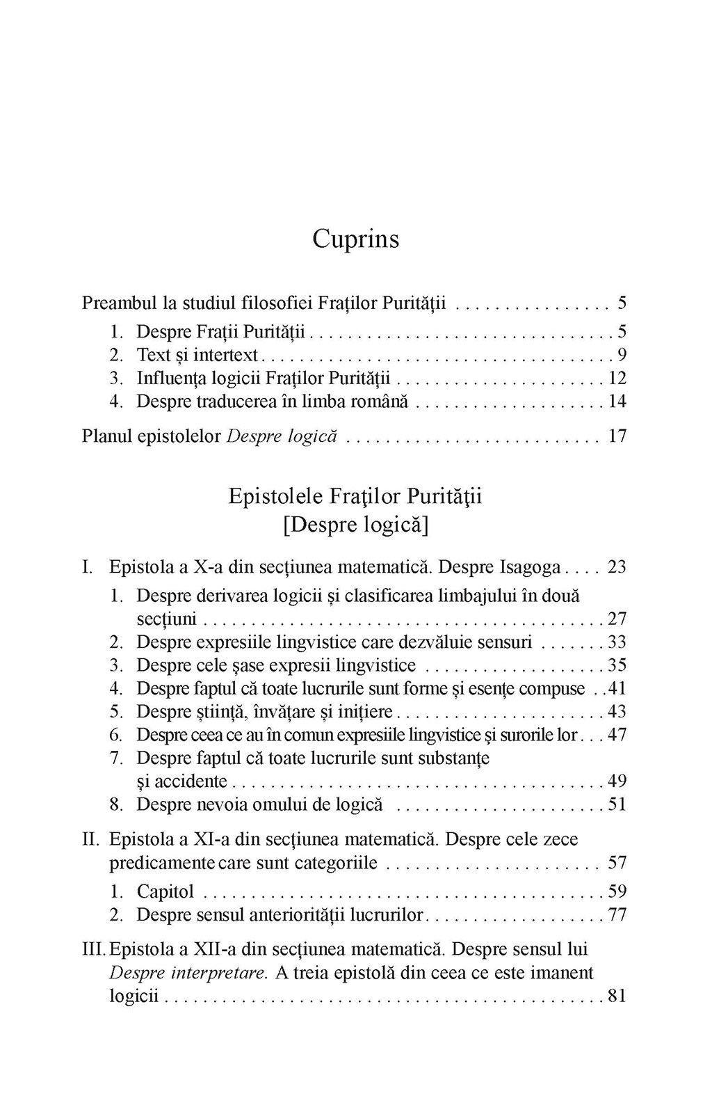 Fragmentul Despre logică din Epistolele Fraților Purității marchează debutul studiului logicii din spațiul cultural arab al secolului al X-lea. El expune percepția acestui grup intelectual asupra instrumentului filosofiei și reflectă una dintre primele etape de creație în filosofia arabă după valul de traduceri din filosofia elină, prin intermediar siriac. Volumul cuprinde traducerea ultimelor cinci epistole (X-XIV), din secțiunea „Ar-rasā’ilu r-riyāḍiyyatu” („Epistolele despre <științele> matematice”) a enciclopediei Rasā’il („Epistole”), după ediția lui Khairaddīn Az-Ziriklī.