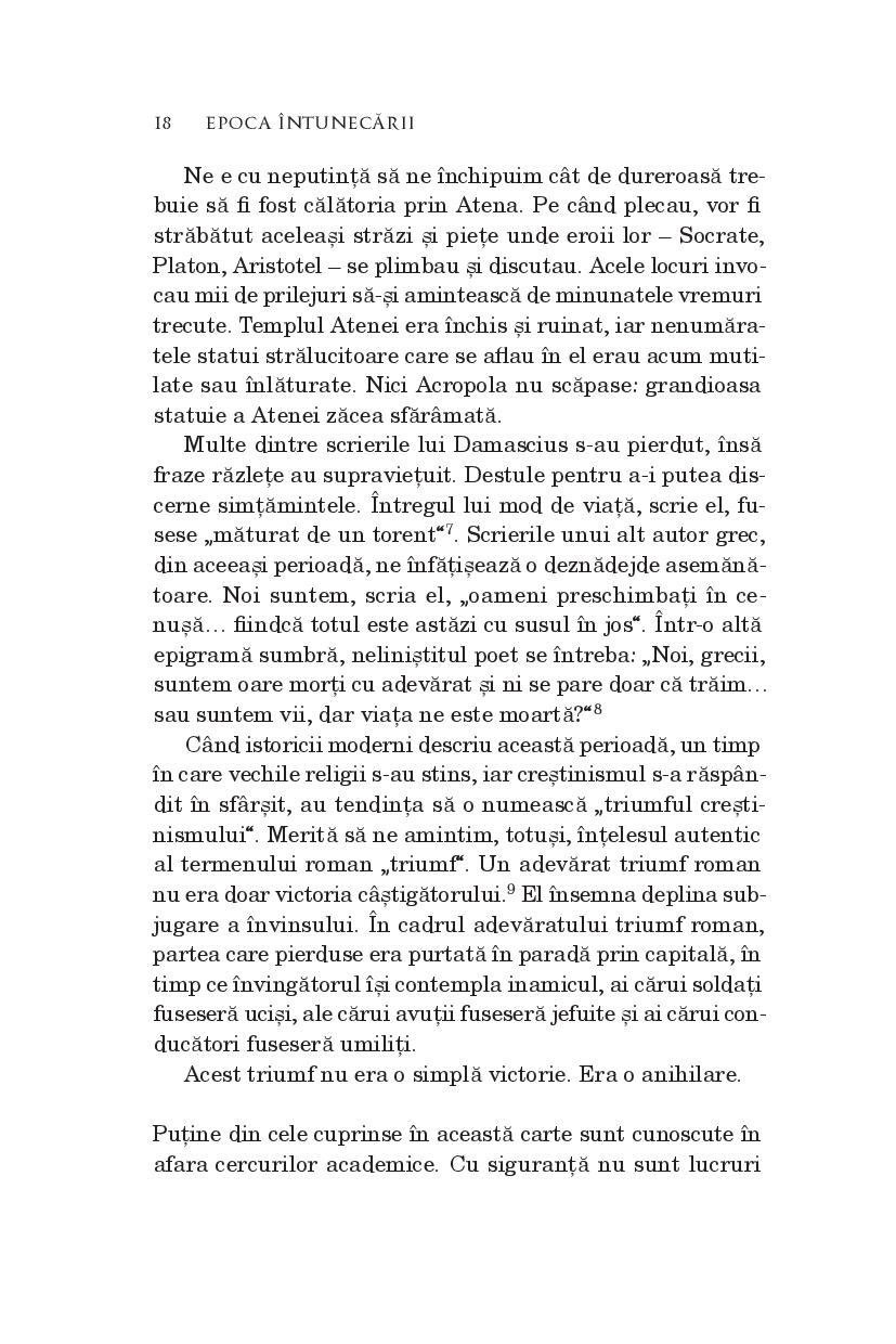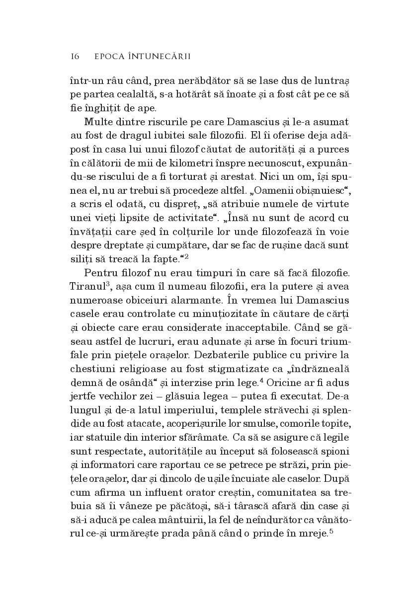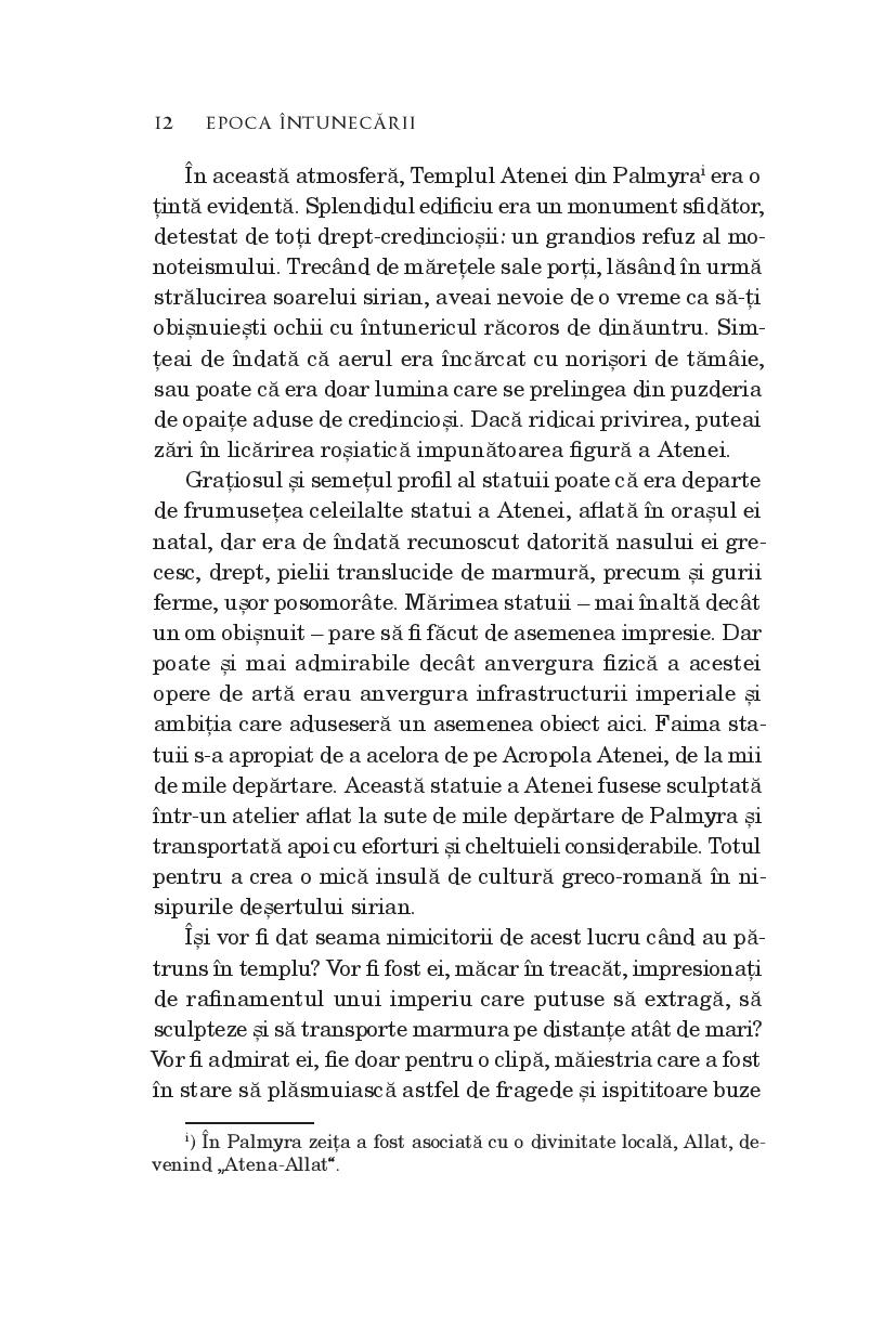 Epoca întunecării ne poartă într-o călătorie de jur împrejurul Mediteranei, de la Roma la Alexandria și din deșerturile Siriei până la Atena, demontând o tradiție plină de stereotipuri și prejudecăți care îi prezintă pe creștini drept victime ale persecuțiilor păgâne. Mutilarea statuilor, arderea marilor biblioteci, dărâmarea Templului lui Serapis din Alexandria, distrugerea Palmyrei, uciderea cu sălbăticie a Hypatiei, actele de vandalism ale monahilor creștini, controlul totalitar asupra vieții private, interzicerea filozofiei, misoginia, intoleranța și ura față de ceilalți sunt ipostazele mai puțin cunoscute ale primelor secole de creștinism.
