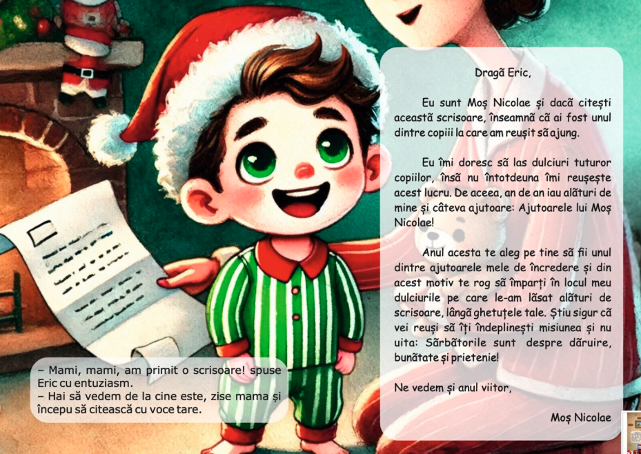 In dimineata de Sfantul Nicolae, gaseste langa ghetute o cutie frumos impachetata si o scrisoare. Curios, o roaga pe mama sa i-o citeasca si afla ca Mos Nicolae are nevoie de ajutorul lui!