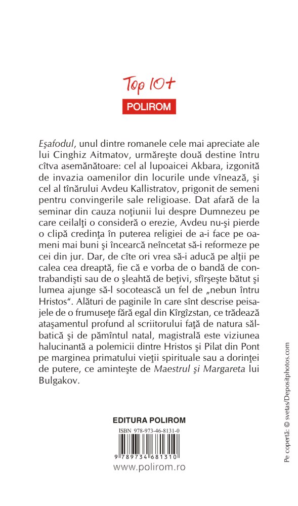 Eşafodul, unul dintre romanele cele mai apreciate ale lui Cinghiz Aitmatov, urmăreşte două destine întru cîtva asemănătoare: cel al lupoaicei Akbara, izgonită de invazia oamenilor din locurile unde vînează, şi cel al tînărului Avdeu Kallistratov, prigonit de semeni pentru convingerile sale religioase. Dat afară de la seminar din cauza noţiunii lui despre Dumnezeu pe care ceilalţi o consideră o erezie, Avdeu nu-şi pierde o clipă credinţa în puterea religiei de a-i face pe oameni mai buni şi încearcă neîncetat să-i reformeze pe cei din jur. Dar, de cîte ori vrea să-i aducă pe alţii pe calea cea dreaptă, fie că e vorba de o bandă de contrabandişti sau de o şleahtă de beţivi, sfîrşeşte bătut şi lumea ajunge să-l socotească un fel de „nebun întru Hristos”. Alături de paginile în care sînt descrise peisajele de o frumuseţe fără egal din Kîrgîzstan, ce trădează ataşamentul profund al scriitorului faţă de natura sălbatică şi de pămîntul natal, magistrală este viziunea halucinantă a polemicii dintre Hristos şi Pilat din Pont pe marginea primatului vieţii spirituale sau a dorinţei de putere, ce aminteşte de Maestrul şi Margareta lui Bulgakov.