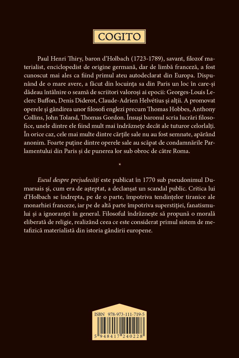 Eseul despre prejudecati este publicat in 1770 sub pseudonimul Dumarsais si, cum era de asteptat, a declansat un scandal public. Critica lui d’Holbach se indrepta, pe de o parte, impotriva tendintelor tiranice ale monarhiei franceze, iar pe de alta parte impotriva superstitiei, fanatismului si a ignorantei in general. Filosoful indrazneste sa propuna o morala eliberata de religie, realizand ceea ce este considerat primul sistem de metafizica materialista din istoria gandirii europene.