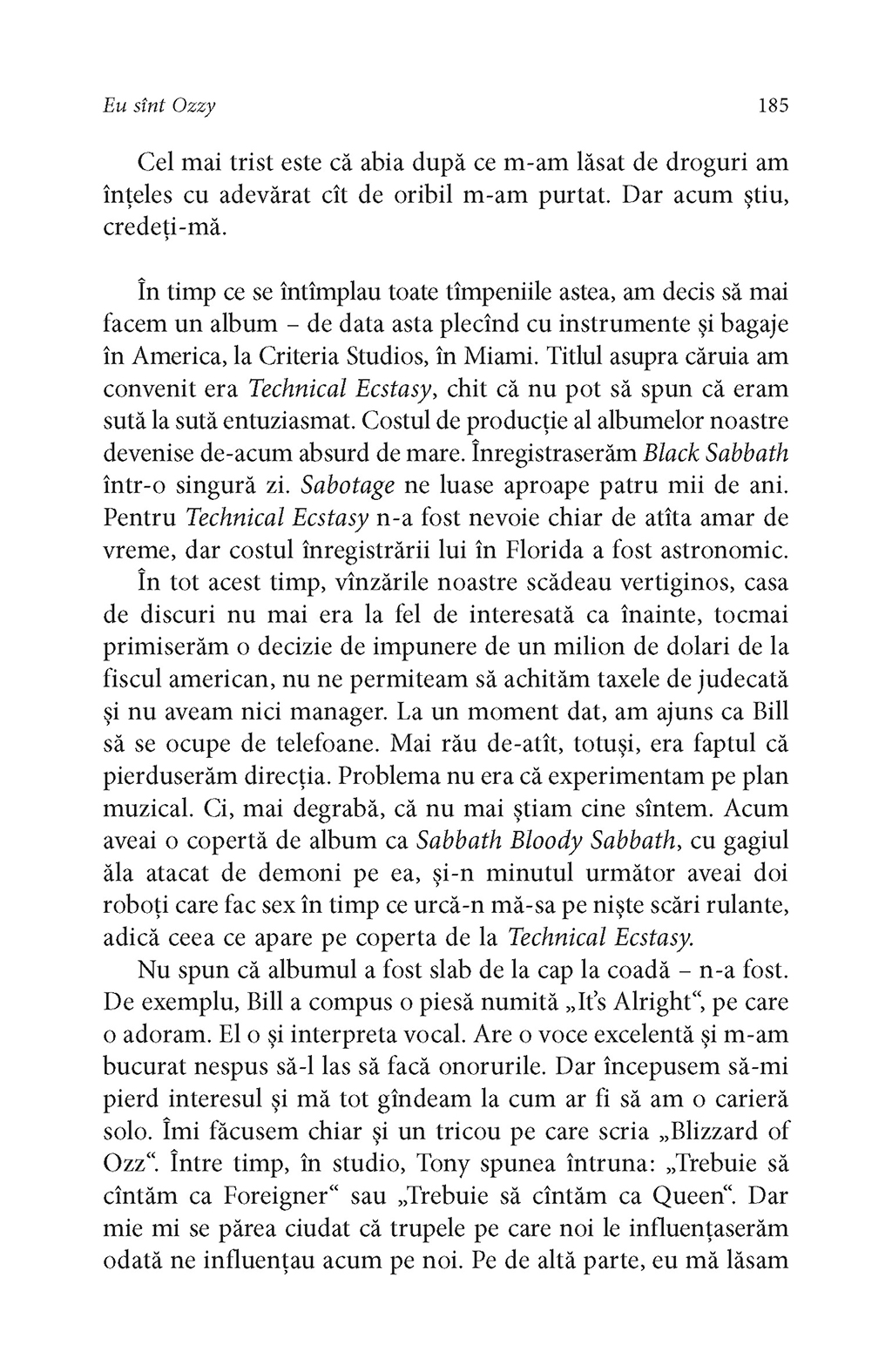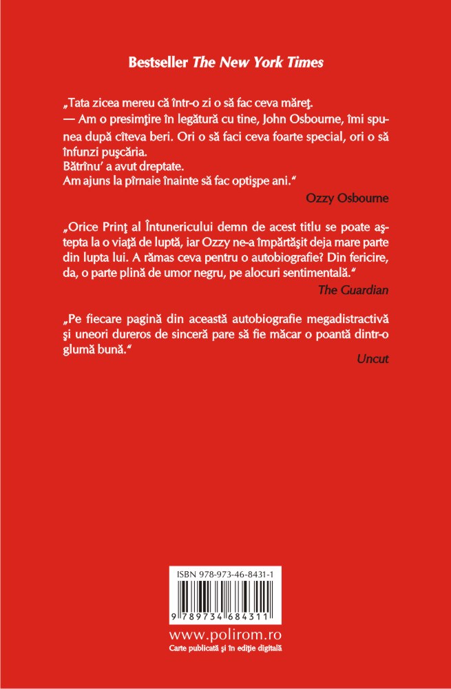 În stilul său colorat şi spumos, Ozzy Osbourne, o legendă a rockului, îşi deapănă incredibila poveste de viaţă, de la copilăria petrecută în sărăcie şi adolescenţa marcată de o condamnare la închisoare pînă la anii celebrităţii, presăraţi cu abuzuri, accese de violenţă şi accidente aproape mortale. Pendulînd între tragic şi comic, povestea începe în Aston, un orăşel industrial dezolant din Marea Britanie, unde tînărul John Osbourne încearcă să-şi facă un viitor şi să cîştige un ban mai întîi ca muncitor în fabrică şi în abator, apoi dînd spargeri mărunte. După un şir de eşecuri, Ozzy se îndreaptă spre muzică, unica lui şansă de-a fenta destinul sumbru ce-i aşteaptă pe majoritatea locuitorilor din Aston. Cititorii vor fi martorii începuturilor trupei Black Sabbath şi ai transformării lui Ozzy în starul rock care a vîndut peste o sută de milioane de discuri. Dincolo de strălucirea celebrităţii, muzicianul vorbeşte cu regret despre latura întunecată a personalităţii sale: dependenţa de alcool şi droguri, predilecţia pentru arme şi cruzimea faţă de animale.