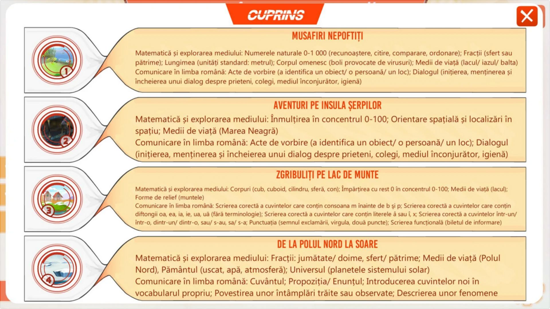 Pachetul educațional este format dintr-o aplicație educativă și o revistă (64 de pagini color), adresându-se elevilor din clasa a II-a.
