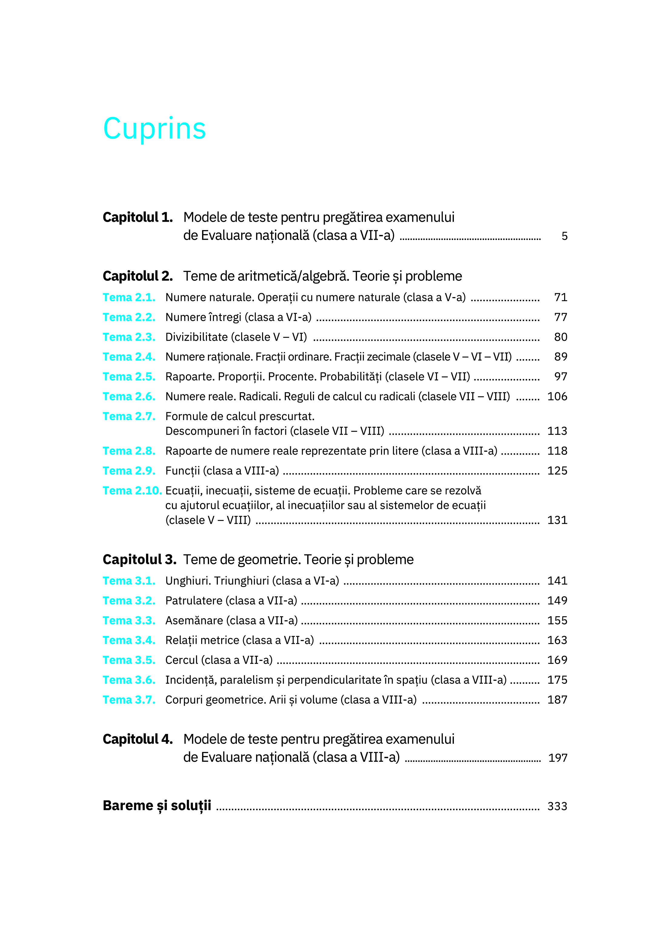 • realizează recapitularea materiei prevăzute de noua programă pentru examenul de Evaluare naţională de la sfârşitul clasei a VIII-a, prin 10 teme de aritmetică şi algebră şi 7 teme de geometrie;