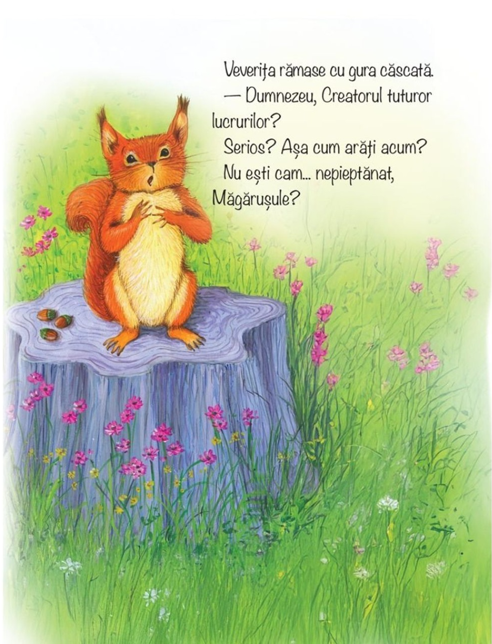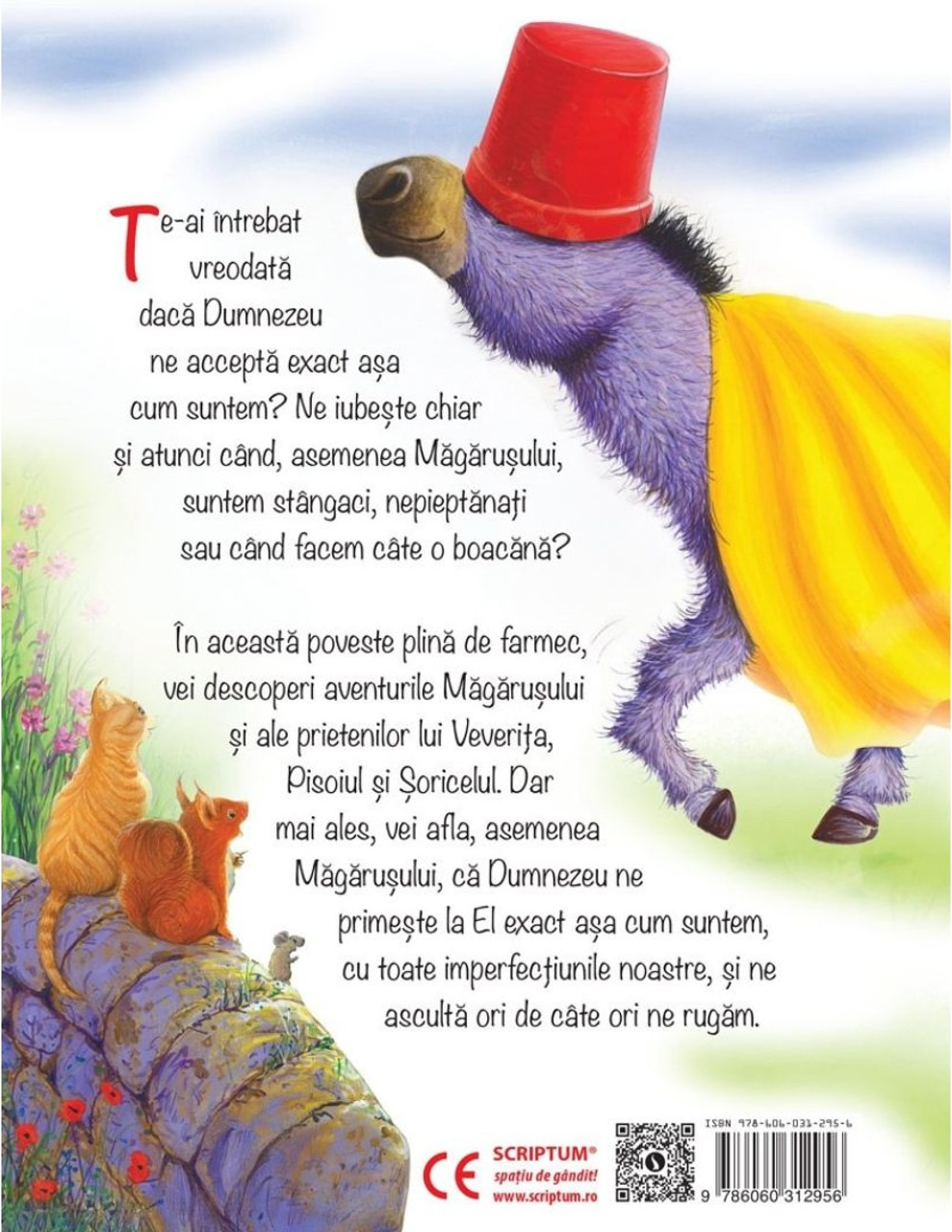 In aceasta poveste plina de farmec, vei descoperi aventurile Magarusului si ale prietenilor lui Veverita, Pisoiul si Soricelul. Dar mai ales, vei afla, asemenea Magarusului, ca Dumnezeu ne primeste la El exact asa cum suntem, cu toate imperfectiunile noastre, si ne asculta ori de cate ori ne rugam.