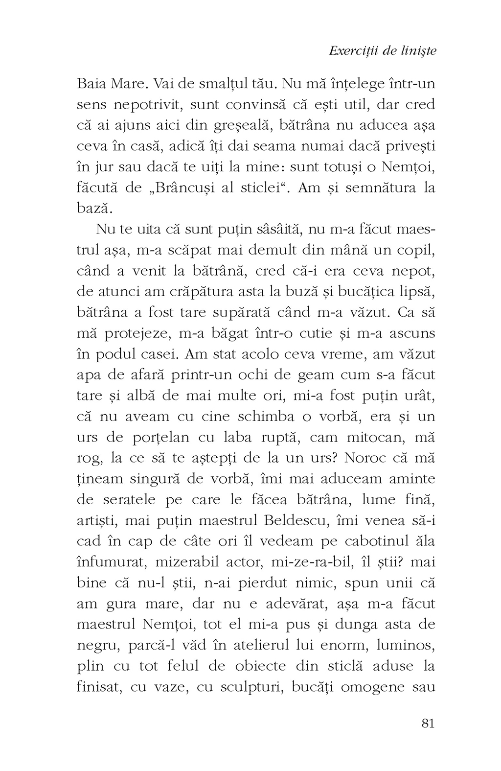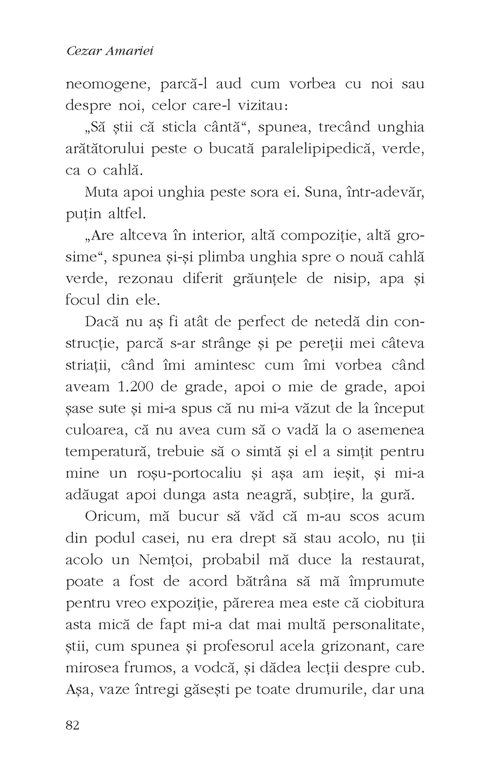 „L-am cunoscut întîmplător (o întîmplare fericită) pe Cezar Amariei. Habar n-aveam că am în față un scriitor matur, cu o experiență solidă de scris – publicase deja un roman, dar, așa cum se întîmplă, din păcate, cu scriitorii din provincie, debutul lui a trecut aproape neobservat. Cezar venise să învețe ceva nou despre «scris». În scurt timp mi-am dat seama că nu prea am ce să îl învăț. Poate lucruri simple și observații minore. Avea o precizie în compoziție, idei interesante, spirit de observație ascuțit, puncte de vedere originale – toate astea sînt însă doar premisele – și avea, esențial, un stil al lui, o frază bine articulată. Acolo am devenit atent. Pentru Cezar, a spune o poveste e o încîntare, o provocare și o aventură a gîndirii. Iar această încîntare se transmite rapid și temeinic cititorului.