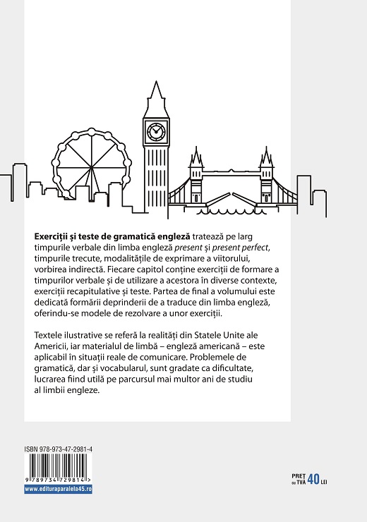 Exerciții și teste de gramatică engleză tratează pe larg timpurile verbale din limba engleză present și present perfect, timpurile trecute, modalitățile de exprimare a viitorului, vorbirea indirectă. Fiecare capitol conține exerciții de formare a timpurilor verbale și de utilizare a acestora în diverse contexte, exerciții recapitulative și teste. Partea de final a volumului este dedicată formării deprinderii de a traduce din limba engleză, oferindu-se modele de rezolvare a unor exerciții.