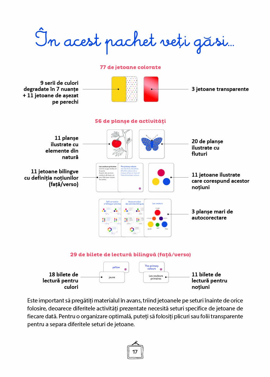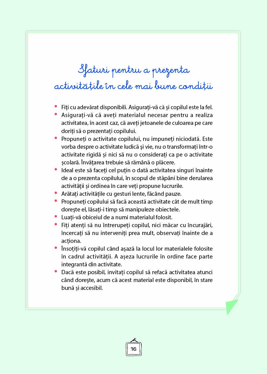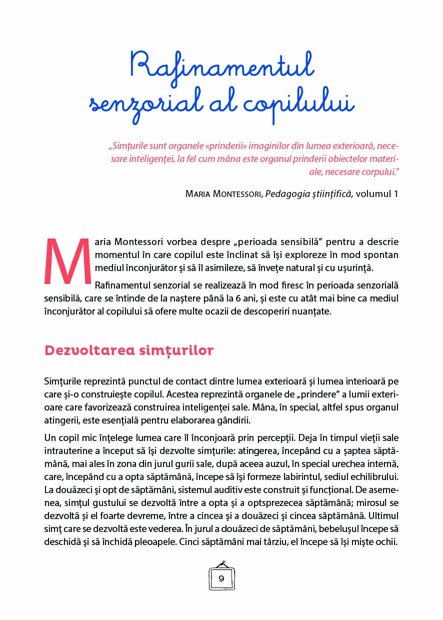 - o broșură cu Maria Montessori, rafinament senzorial, lecția în trei pași și multe activități distractive și provocatoare.
