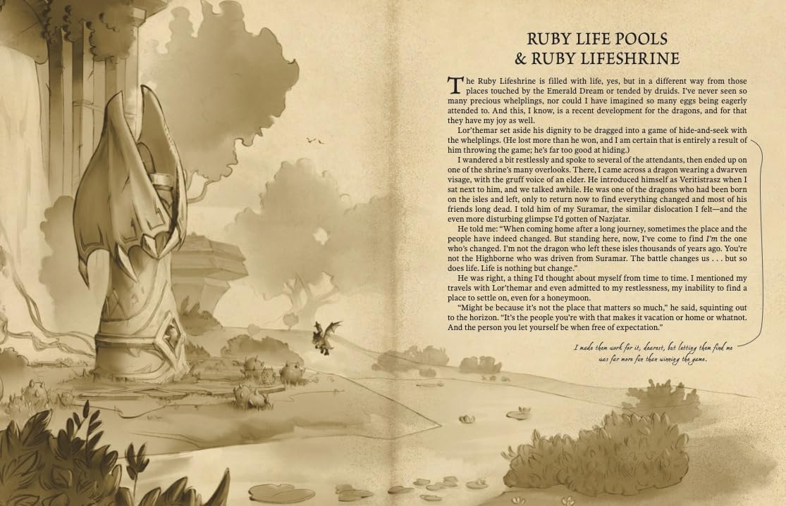 With duty delaying their honeymoon for years, First Arcanist Thalyssra and Lord Regent Lor'themar Theron finally resolve to set sail, seeking the perfect setting to celebrate their love. Join the happy couple as they travel to distant shores, scouting for the perfect sunset and learning that it is the journey - and those with whom we share it - that should be cherished most.