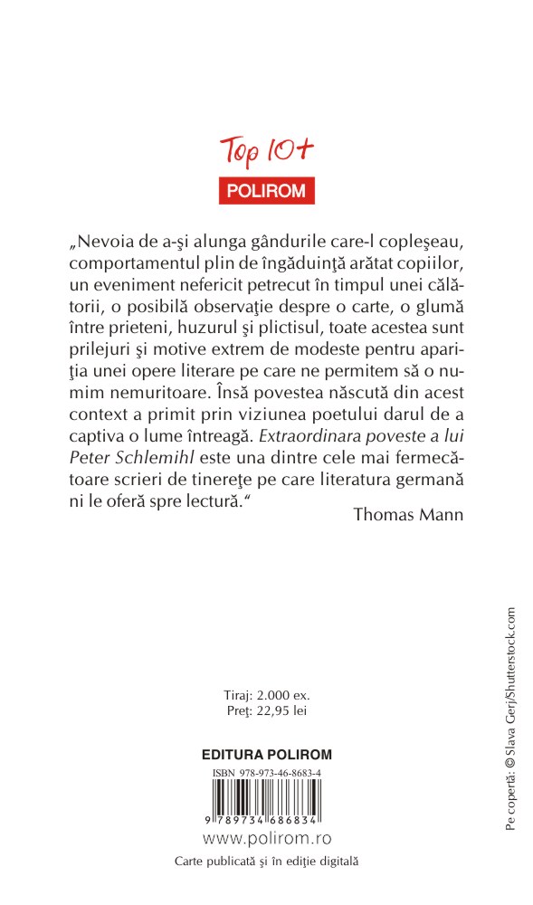 „Nevoia de a‑şi alunga gîndurile care‑l copleşeau, comportamentul plin de îngăduinţă arătat copiilor, un eveniment nefericit petrecut în timpul unei călătorii, o posibilă observaţie despre o carte, o glumă între prieteni, huzurul şi plictisul, toate acestea sînt prilejuri şi motive extrem de modeste pentru apariţia unei opere literare pe care ne permitem să o numim nemuritoare. Însă povestea născută din acest context a primit prin viziunea poetului darul de a captiva o lume întreagă. Extraordinara poveste a lui Peter Schlemihl este una dintre cele mai fermecătoare scrieri de tinereţe pe care literatura germană ni le oferă spre lectură.” (Thomas Mann)
