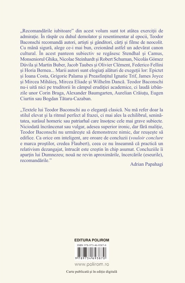 „Recomandările iubitoare” din acest volum sunt tot atâtea exerciţii de admiraţie. În răspăr cu duhul demolator şi resentimentar al epocii, Teodor Baconschi recomandă autori, artişti şi gânditori, cărţi şi filme de neocolit. Cu mână sigură, alege ce-i mai bun, creionând astfel un adevărat canon cultural. În acest panteon subiectiv se regăsesc Stendhal şi Camus, Monseniorul Ghika, Nicolae Steinhardt şi Robert Schuman, Nicolás Gómez Dávila şi Martin Buber, Jacob Taubes şi Olivier Clément, Federico Fellini şi Horia Bernea... Marii autori sunt elogiaţi alături de exegeţii lor: Epictet şi Ioana Costa, Grigorie Palama şi Preasfinţitul Ignatie Trif, James Joyce şi Mircea Mihăieş, Mircea Eliade şi Wilhelm Dancă. Teodor Baconschi nu-i uită nici pe truditorii în câmpul erudiţiei academice, ci laudă izbânzile unor Corin Braga, Alexander Baumgarten, Aurelian Crăiuţu, Eugen Ciurtin sau Bogdan Tătaru-Cazaban.