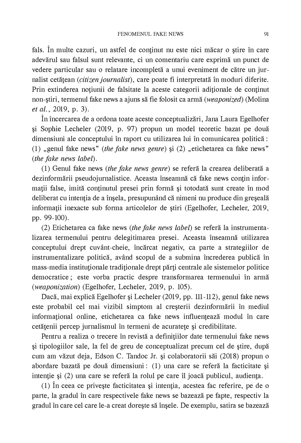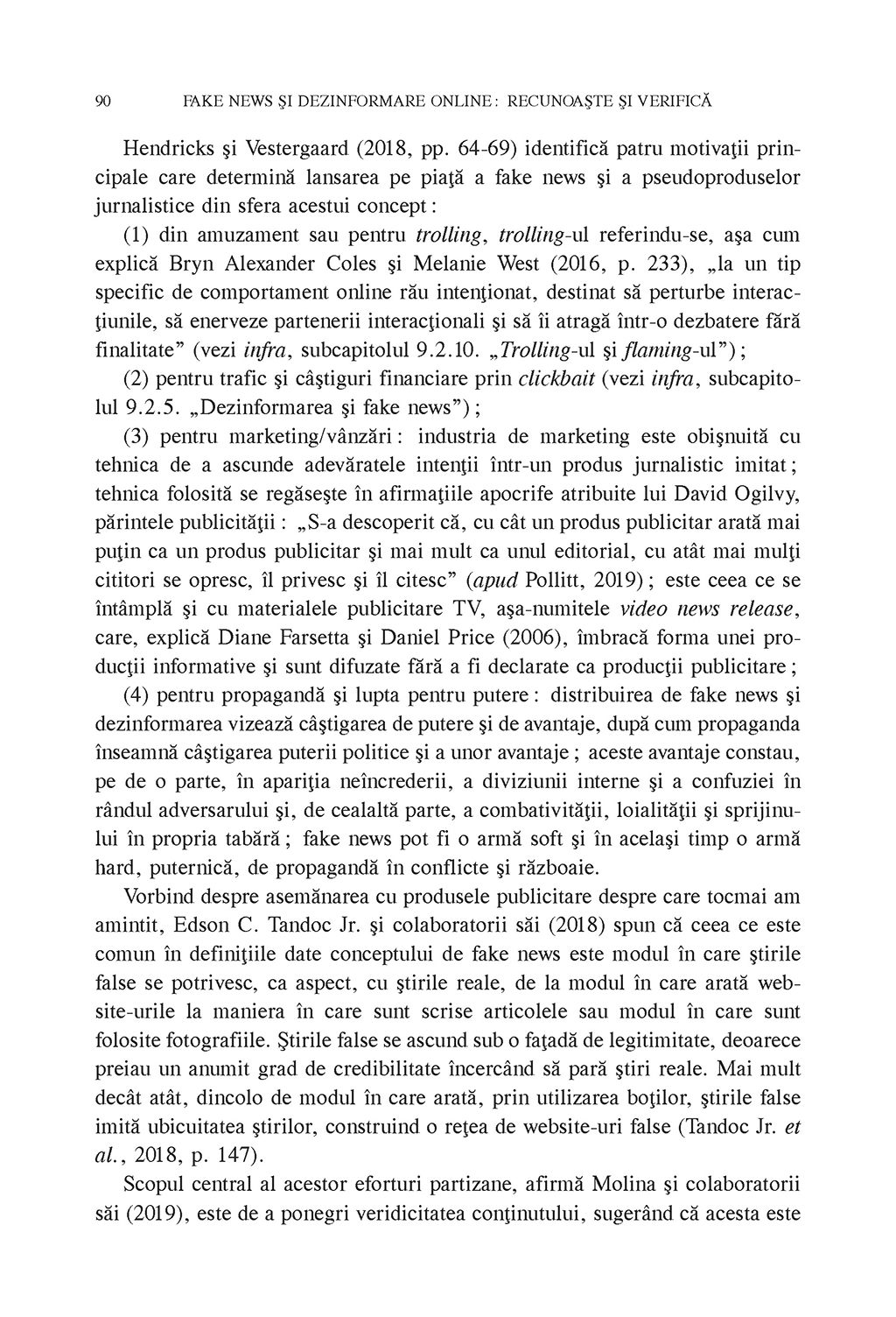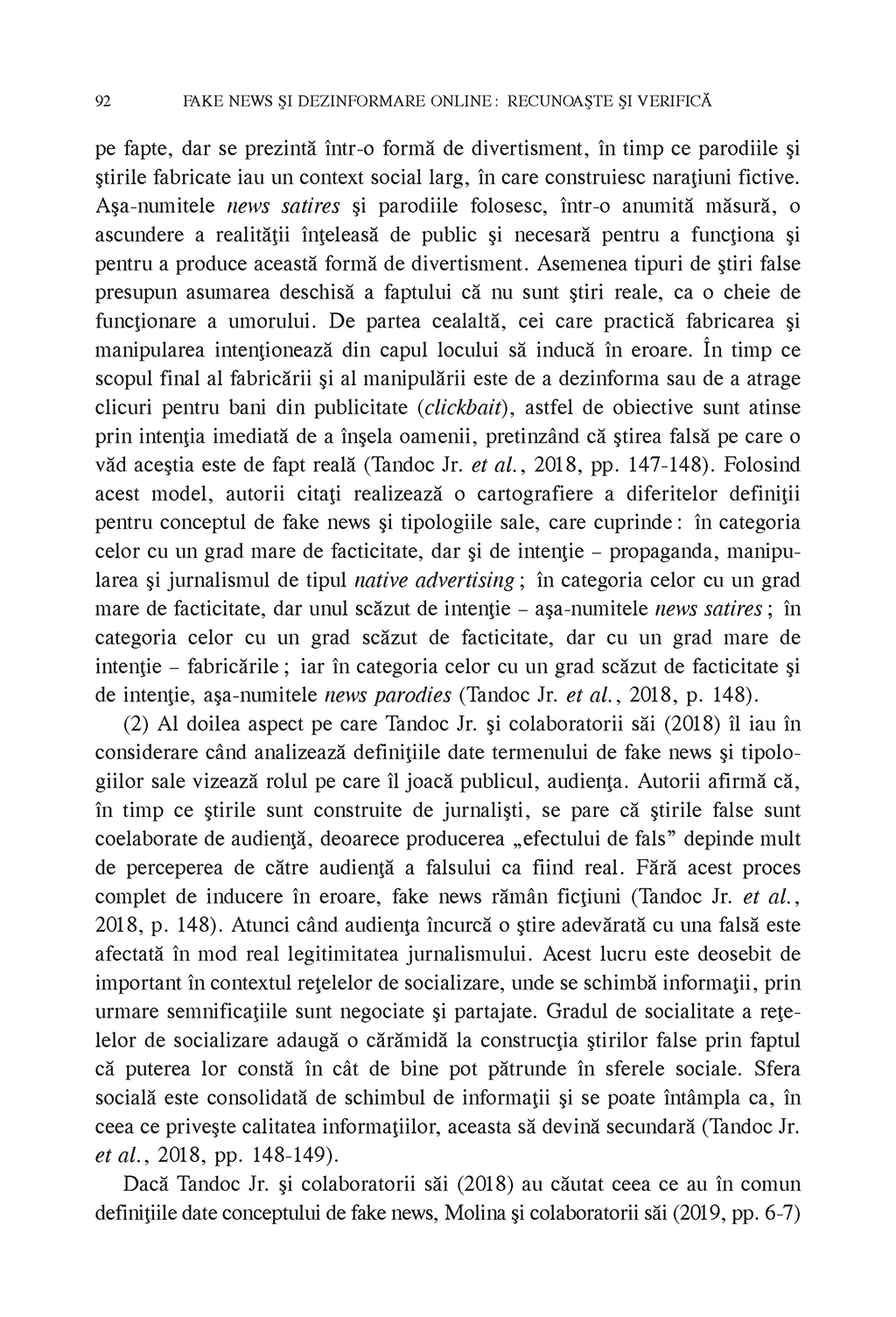 „Cartea este o sinteză a dezbaterilor pe tema dezinformării și manipulării, dublată de analize de caz și de o sumă de tehnici de identificare a fake news. Ea se impune prin efortul de a face ordine într-o junglă a textelor referitoare la fake news, la dezinformare și la formele de influențare a publicurilor (persuasiune, propagandă, manipulare etc.), scoțînd în evidență liniile de forță ale discuțiilor și controverselor. În plus, cartea prezintă mai multe modele de interpretare a fenomenelor din zona cercetată (modelul «Lund», modelul «Pennsylvania» etc.): analiza acestora este detaliată, cu accent pe aplicarea lor în cercetarea formelor diverse ale dezinformării. Studiile de caz dezvăluie complexitatea acestor fenomene și oferă baza pentru prezentarea unor strategii de «apărare» și a unor tehnici de «detectare», cu aplicație îndeosebi în social media.” (Mihai Coman)