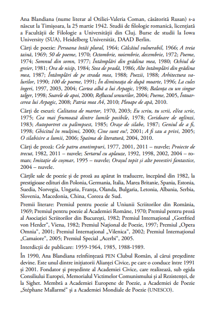 Nu am scris această carte pentru a transmite un adevăr pe care eu îl deţin, ci pentru a găsi un adevăr de care eu am nevoie. Sensul ei nu este să acopere, ci să descopere ceva.“ — ANA BLANDIANA