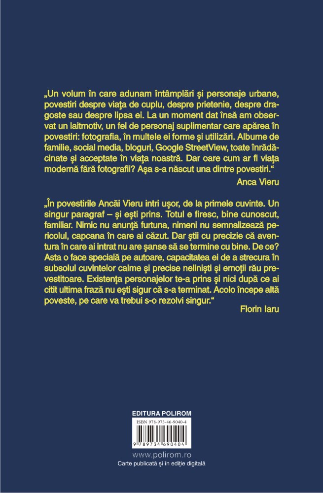 „Un volum în care adunam întâmplări și personaje urbane, povestiri despre viața de cuplu, despre prietenie, despre dragoste sau despre lipsa ei. La un moment dat însă am observat un laitmotiv, un fel de personaj suplimentar care apărea în povestiri: fotografia, în multele ei forme și utilizări. Albume de familie, social media, bloguri, Google StreetView, toate înrădăcinate și acceptate în viața noastră. Dar oare cum ar fi viața modernă fără fotografii? Așa s-a născut una dintre povestiri.” (Anca Vieru)