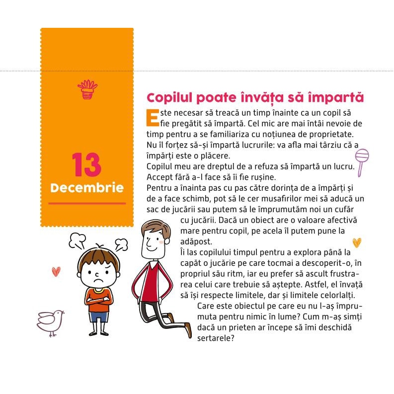 Acest calendar este, prin urmare, un tovaras ideal pentru a porni pe calea unei educatii bine tratate sau pentru a gasi mementouri utile atunci cand aceasta cale este foarte dificila. Va va ajuta sa va treziti creativitatea pe care o aveti in dumneavoastra si sa o puneti in beneficiul copiilor dumneavoastra.