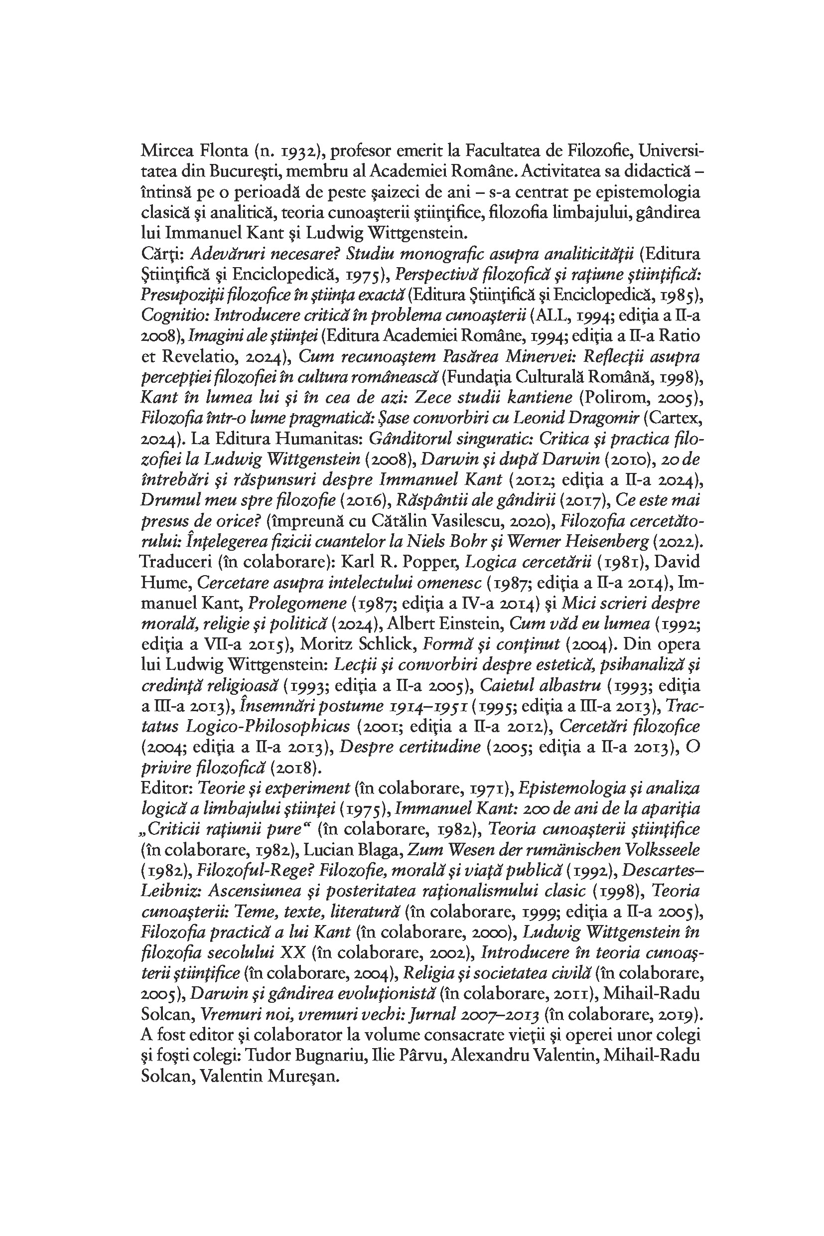 MIRCEA FLONTA (n. 1932), profesor emerit la Facultatea de Filozofie, Universitatea din București, membru al Academiei Române. Activitatea sa didactică – întinsă pe o perioadă de peste șaizeci de ani – s-a centrat pe epistemologia cla sică și analitică, teoria cunoașterii științifice, filozofia limbajului, gândirea lui Immanuel Kant și Ludwig Wittgenstein. A publicat, în țară și străinătate, numeroase studii și articole în reviste și culegeri de studii. A tradus, în colaborare, din operele filozofice ale lui David Hume, Immanuel Kant, Albert Einstein, Moritz Schlick, Karl Popper și Ludwig Wittgenstein. Volume: Adevăruri necesare? Studiu monografic asupra analiticităţii (Editura Științifică și Enciclopedică, 1975), Perspectivă filozofică și raţiune știinţifică: Presupoziţii filozofice în știinţa exactă (Editura Științifică și Enciclopedică, 1985), Cognitio: O introducere critică în problema cunoașterii (ALL, 1994; ediția a II-a 2008), Imagini ale știinţei (Editura Academiei Române, 1994), Cum recunoaștem Pasărea Minervei? Reflecţii asupra percepţiei filozofiei în cultura românească (Fundația Culturală Română, 1998), Kant în lumea lui și în cea de azi: Zece studii kantiene (Polirom, 2005), Gânditorul singuratic: Critica și practica filozofiei la Ludwig Wittgenstein (Humanitas, 2008), Darwin și după Darwin: Studii de filozofie a biologiei (Humanitas, 2010), 20 de întrebări și răspunsuri despre Immanuel Kant (Humanitas, 2012; ediția a II-a 2024), Drumul meu spre filozofie (Humanitas, 2016), Răspântii ale gândirii: Despre identitatea filozofiei, relaţia știinţă–religie și alte subiecte de interes general (Humanitas, 2017), Ce este mai presus de orice? Lumea cercetătorilor între iubirea de patrie și spiritul universalist al știinţei în timpul Primului Război Mondial (împreună cu Cătălin Vasilescu, Humanitas, 2020), Filozofia cercetătorului: Înţelegerea fizicii cuantelor la Niels Bohr și Werner Heisenberg (Humanitas, 2022).