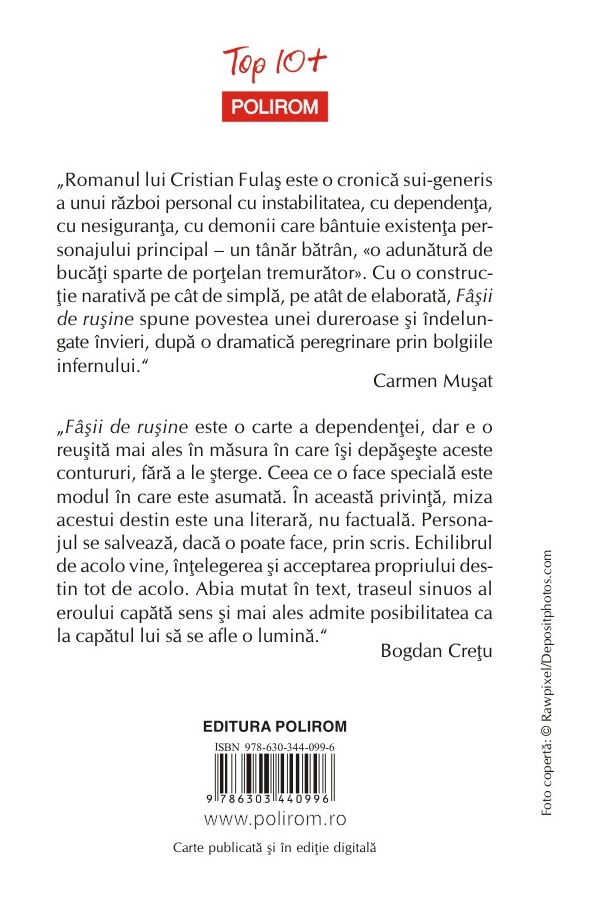 „Fâşii de ruşine este o carte a dependenţei, dar e o reuşită mai ales în măsura în care îşi depăşeşte aceste contururi, fără a le şterge. Ceea ce o face specială este modul în care este asumată. În această privinţă, miza acestui destin este una literară, nu factuală. Personajul se salvează, dacă o poate face, prin scris. Echilibrul de acolo vine, înţelegerea şi acceptarea propriului destin tot de acolo. Abia mutat în text, traseul sinuos al eroului capătă sens şi mai ales admite posibilitatea ca la capătul lui să se afle o lumină. Redempţiunea nu e aşteptată sub forma unei «rezolvări» clinice a dependenţei, fapt, la urma urmelor, secundar; ea vine (sau nu) în măsura în care acesta, fiind şi scriitor, va reuşi să stoarcă din ceea ce trăieşte seva unei naraţiuni ritmate, tensionate, sacadate, dar care să transforme întreaga depresie prelungită într-o izbândă... nu spun estetică, ci discursivă. Şi mă feresc să discut despre o «salvare prin estetic» pentru că resortul acestui text nu e unul estetic, ci unul existenţial.” (Bogdan Creţu)
