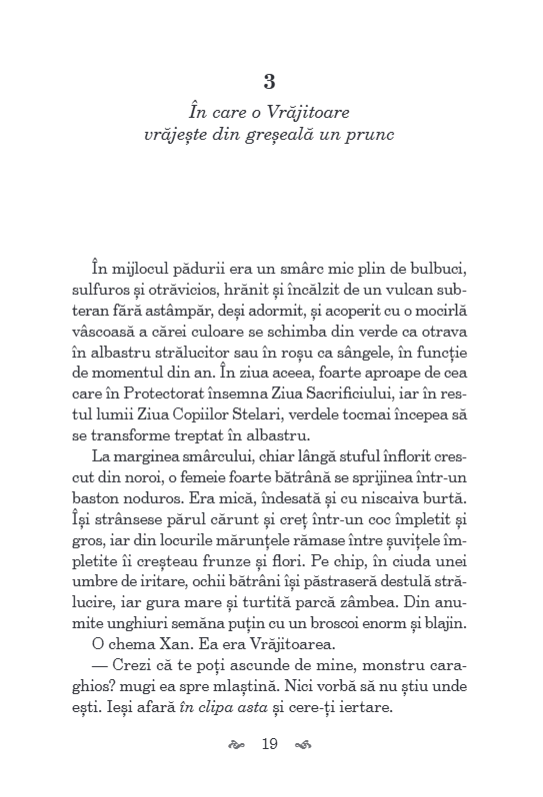 Pe drum, Xan îi ține pe copii la piept și le dă să bea lumina stelelor. O dată, o singură dată, din greșeală, bătrâna hrănește o fetiță cu lumina lunii, dându-i astfel puteri magice neînchipuit de mari și legându-și pe vecie destinul de al fetei care a băut luna.