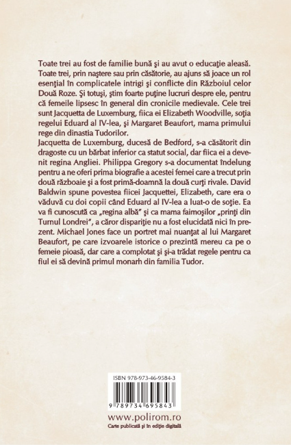 Toate trei au fost de familie bună şi au avut o educaţie aleasă. Toate trei, prin naştere sau prin căsătorie, au ajuns să joace un rol esenţial în complicatele intrigi şi conflicte din Războiul celor Două Roze. Şi totuşi, ştim foarte puţine lucruri despre ele, pentru că femeile lipsesc în general din cronicile medievale. Cele trei sunt Jacquetta de Luxemburg, fiica ei Elizabeth Woodville, soţia regelui Eduard al IV-lea, şi Margaret Beaufort, mama primului rege din dinastia Tudorilor.