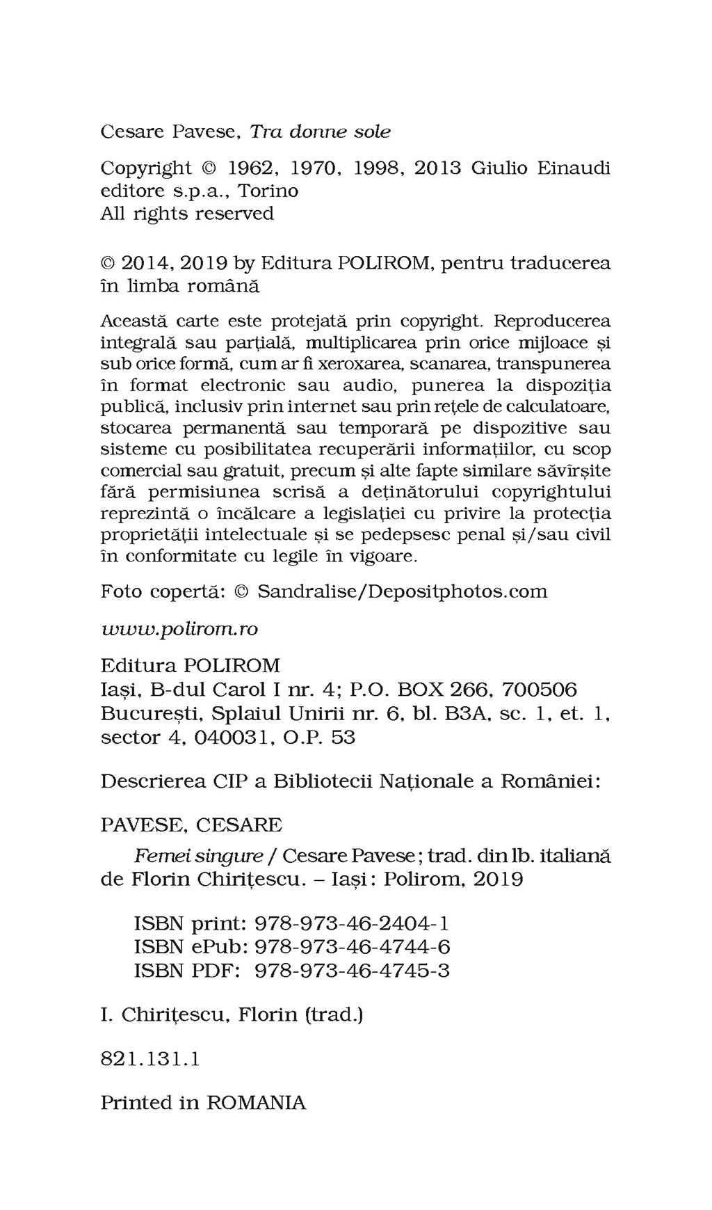 Clelia, o creatoare de modă de succes, se întoarce la Torino, oraşul ei natal, unde urmează să supravegheze deschiderea unui salon. Aici, ea este atrasă într-un cerc de tineri mondeni, într-o lume a restaurantelor şi a marilor cazinouri, a artiştilor şi a petrecerilor. În mijlocul acestei mulţimi de oameni care încearcă să scape de plictiseală, Clelia o întîlneşte pe singuratica Rosetta, o femeie enigmatică şi depresivă, a cărei sinucidere din finalul poveştii anunţă tragic chiar sfîrşitul aceluia care a gîndit personajul: sinuciderea lui Pavese. Femei singure, publicat cu doi ani înainte ca Cesare Pavese să se sinucidă, a primit cel mai apreciat premiu italian pentru literatură: Premiul Strega. Considerat unul dintre momentele importante ale realismului italian, romanul surprinde melancolia şi vidul ce macină o societate prinsă între spleenul decadenţei şi nebuniile hedonismului.