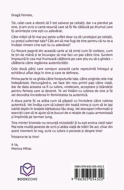 Cu fiecare paginǎ din aceastǎ carte ai să simți cum îți vorbesc, cum te țin de mânǎ și te încurajez sǎ mai faci un pas către tine. Suntem împreunǎ în cea mai frumoasă călătorie pe care știu eu să o ghidez – călătoria către regăsirea autenticității.