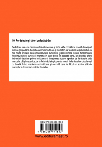 Ferăstrăul este una dintre uneltele elementare și tinde să fie considerat o sculă indispensabilă în orice gospodărie. Se pot economisi multe ore și mult efort, iar lucrările se pot efectua cu mai multă precizie dacă utilizatorul are cunoștințe legate de modul în care funcționează ferăstrăul său și de felul în care îl poate menține în stare bună. În această carte, Ian Bradley oferă îndrumări detaliate privind utilizarea și întreținerea tuturor tipurilor de ferăstraie, atât manuale, cât și mecanice, de la ferăstrăul simplu pentru metal până la ferăstraiele circulare și cu bandă, într-o manieră cuprinzătoare și succintă, care l-a făcut un scriitor atât de respectat în domeniul lucrărilor de atelier.