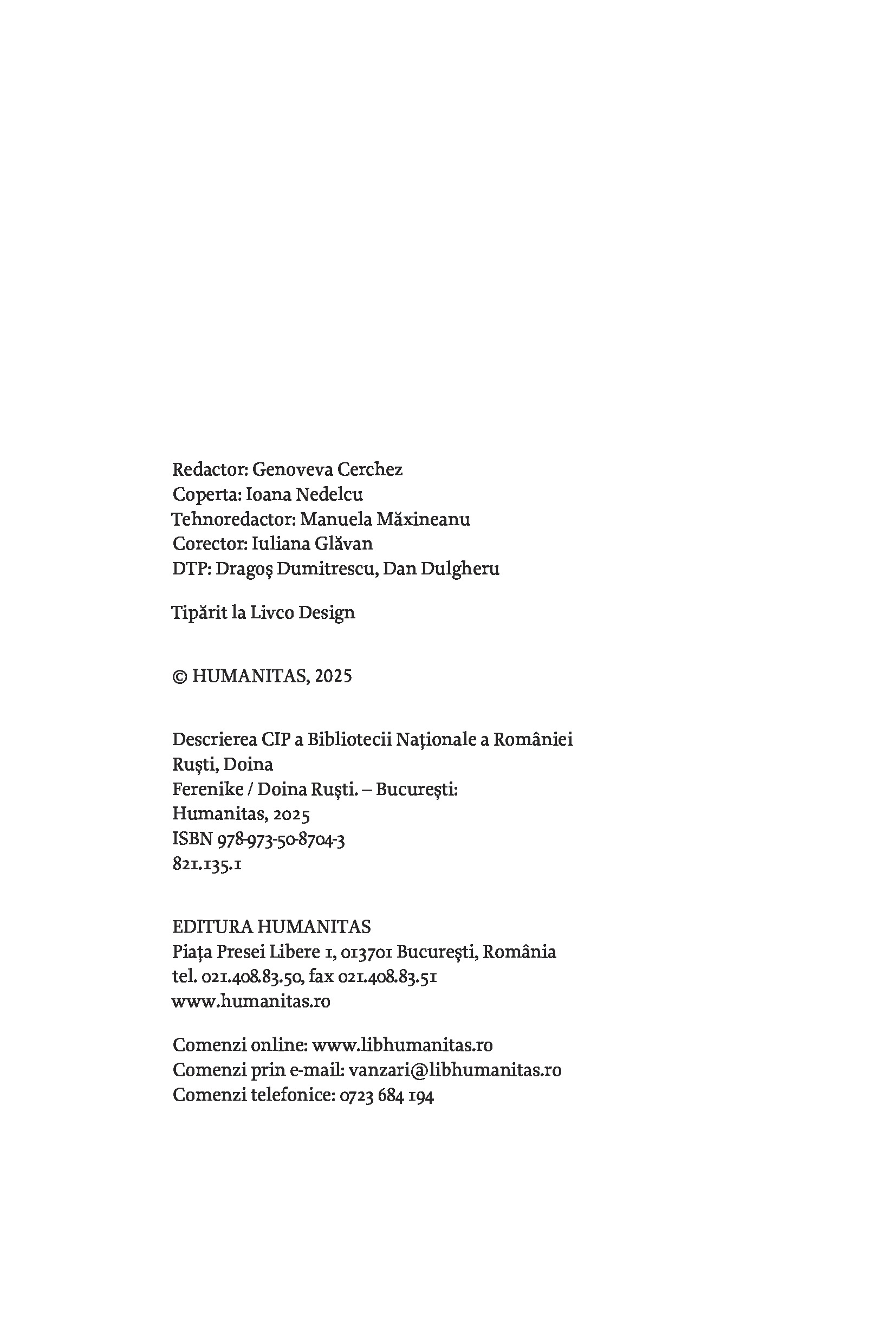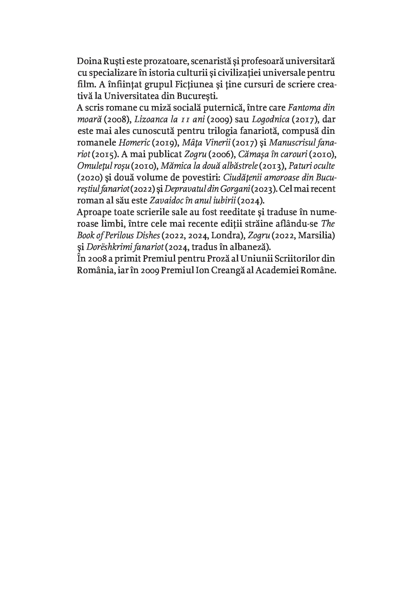 DOINA RUȘTI este prozatoare, scenaristă și profesoară universitară cu specializare în istoria culturii și civilizației universale pentru film. A înființat grupul Ficţiunea și ține cursuri de scriere creativă la Universitatea din București. A scris romane cu miză socială puternică, între care Fantoma din moară (2008), Lizoanca la 11 ani (2009) sau Logodnica (2017), dar este mai ales cunoscută pentru trilogia fanariotă, compusă din romanele Homeric (2019), Mâţa Vinerii (2017) și Manuscrisul fanariot (2015). A mai publicat Zogru (2006), Cămașa în carouri (2010), Omuleţul roșu (2010), Mămica la două albăstrele (2013), Paturi oculte (2020) și două volume de povestiri: Ciudăţenii amoroase din Bucureștiul fanariot (2022) și Depravatul din Gorgani (2023). Cel mai recent roman al său este Zavaidoc în anul iubirii (2024). Aproape toate scrierile sale au fost reeditate și traduse în numeroase limbi, între cele mai recente ediții străine aflându-se The Book of Perilous Dishes (2022, 2024, Londra), Zogru (2022, Marsilia) și Dorëshkrimi fanariot (2024, tradus în albaneză). În 2008 a primit Premiul pentru Proză al Uniunii Scriitorilor din România, iar în 2009 Premiul Ion Creangă al Academiei Române.