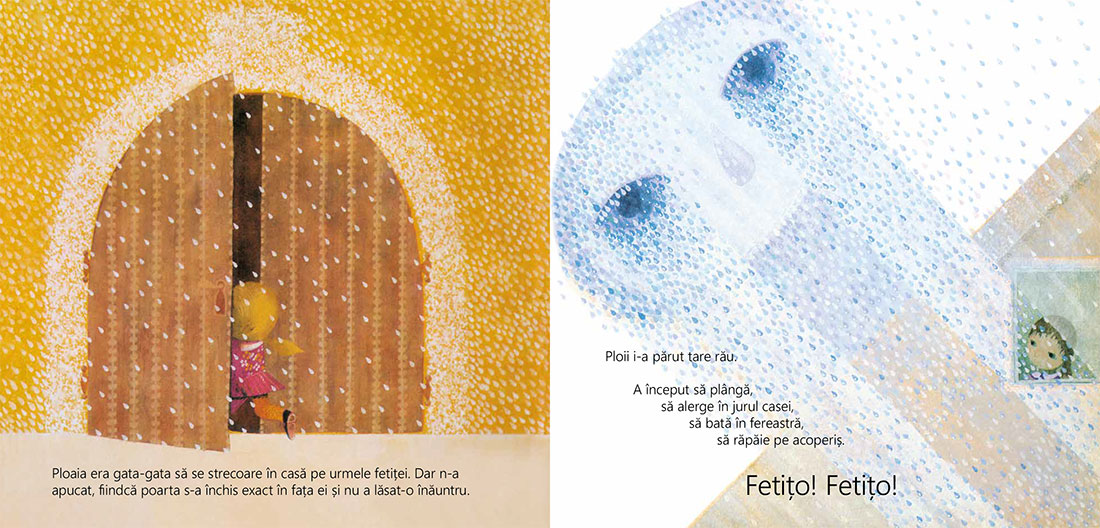 Emoția nu lipsește – ploaia căutând-o pe fetiță într-o mare de umbrele indiferente sau revărsarea de culori de la final, când textul se transformă în poezie, descriind renașterea lumii în lumina soarelui ieșit dintre nori, ne poartă dincolo de desfășurarea aparent simplă a poveștii. Mesajul e subtil și e, de fapt, o invitație. Ce-ar fi să ne copilărim din când în când?