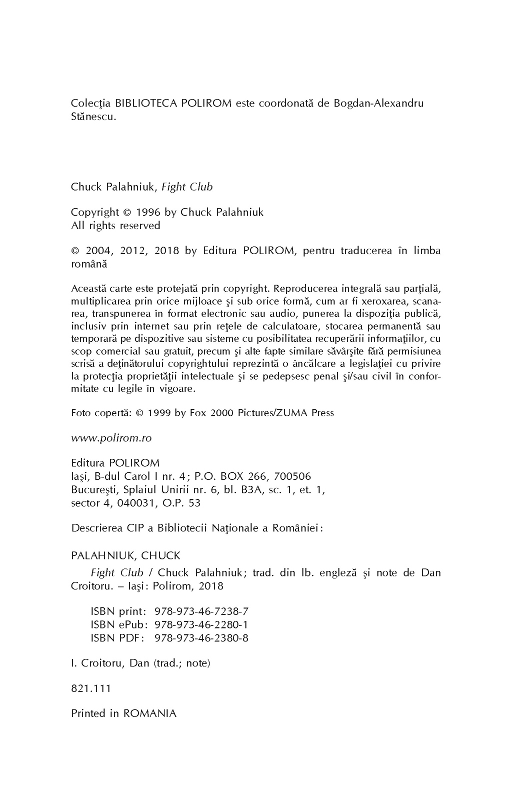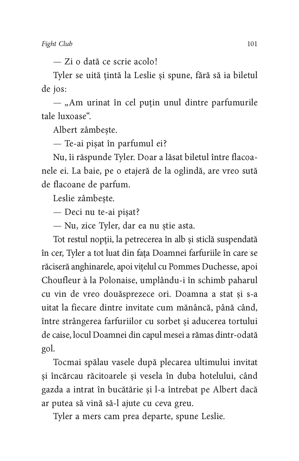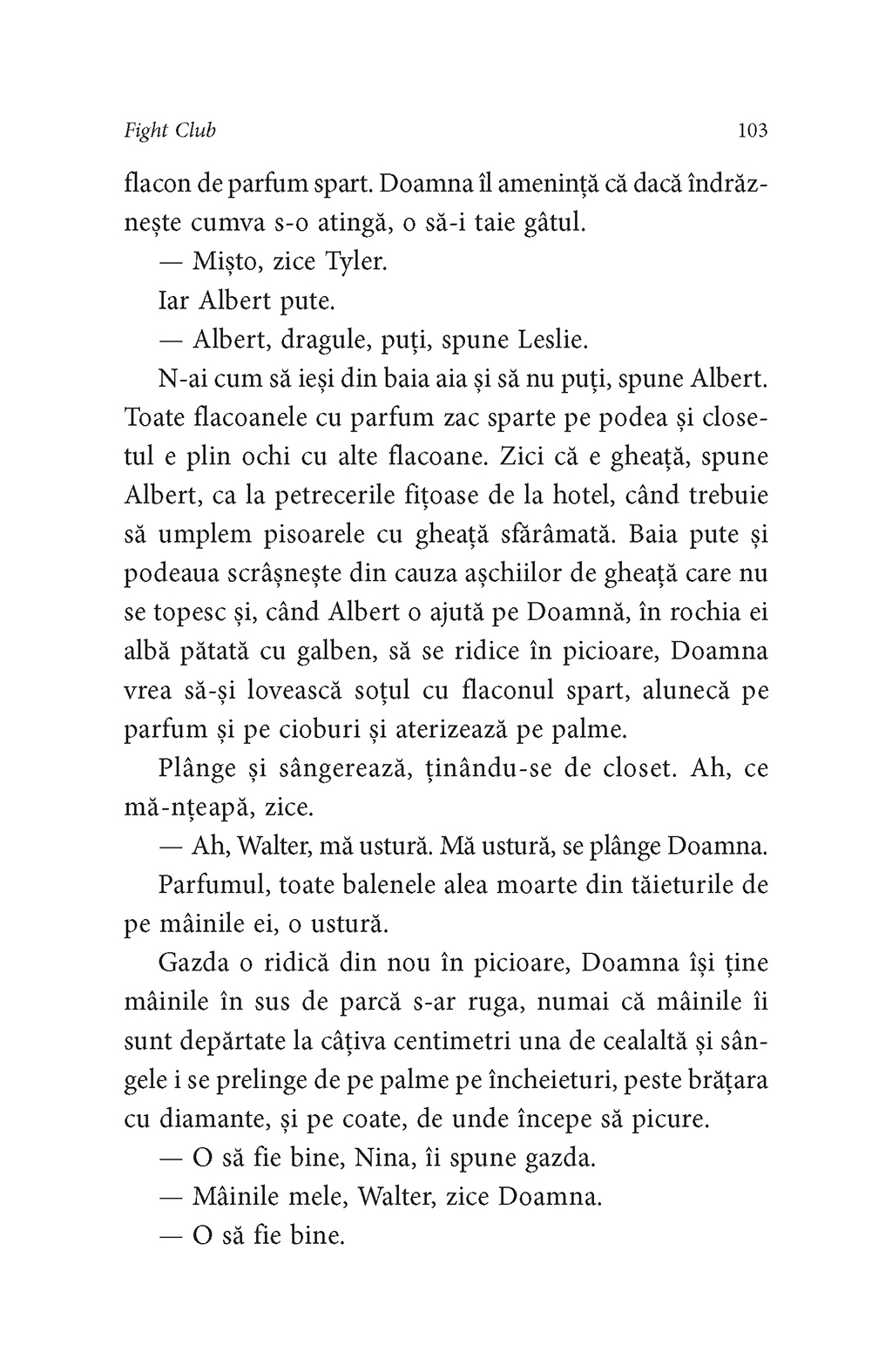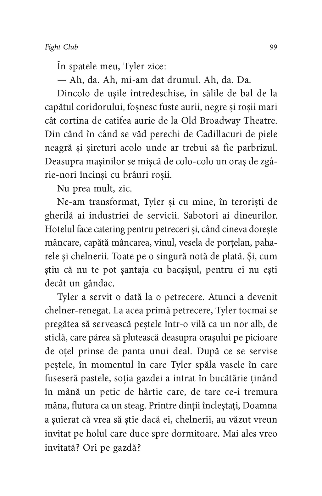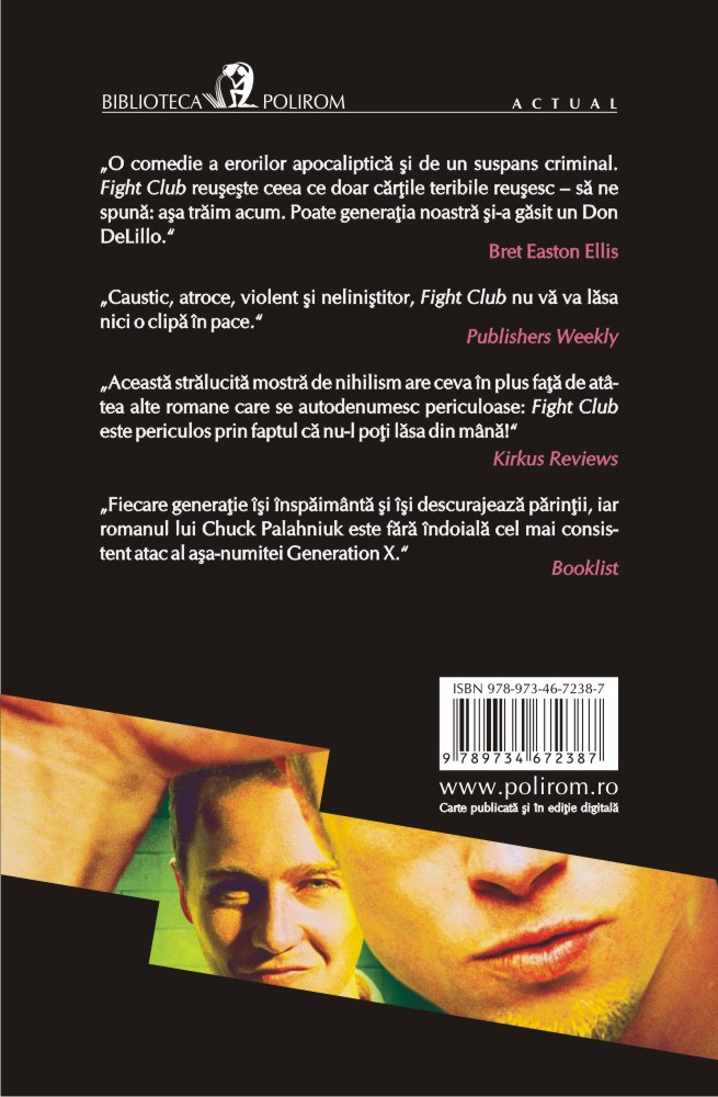 Publicat în 1996 şi devenit un clasic al literaturii underground, Fight Club este unanim considerat unul dintre cele mai originale şi provocatoare romane scrise în ultimul deceniu al secolului XX. Fight Club este povestea unui tînăr înstrăinat, sătul de slujba sa mediocră. El cade sub influenţa unui bărbat enigmatic, pe nume Tyler Durden, care organizează bătăi clandestine în subsolurile barurilor după ora închiderii. Născut din mintea lui Tyler Durden, Fight Club reprezintă un mod de evadare din viaţa măruntă şi restrictivă a lui Tyler şi a tovarăşilor săi. Dar în lumea lor nu există reguli, nu există limite, nu există obstacole.