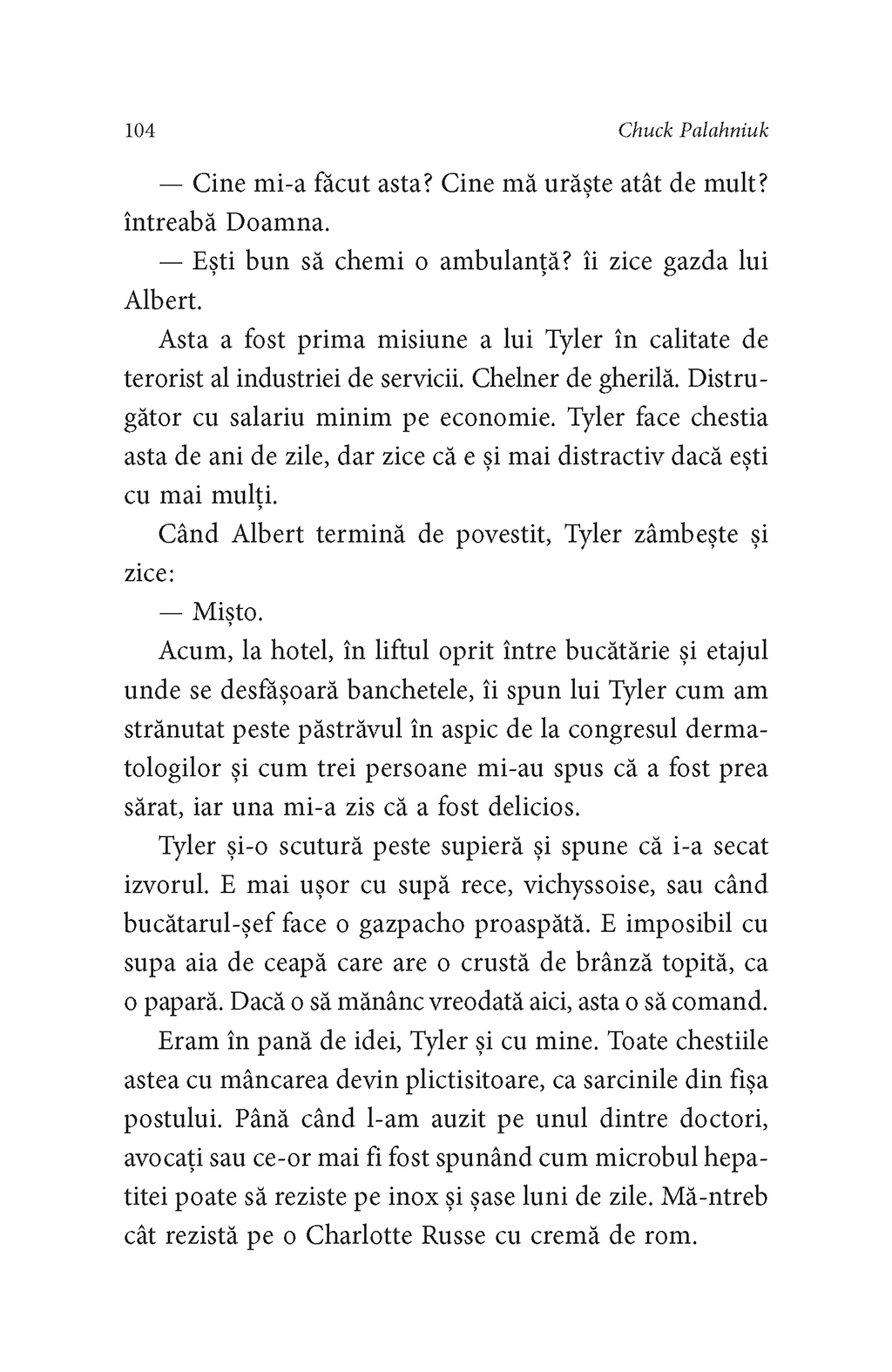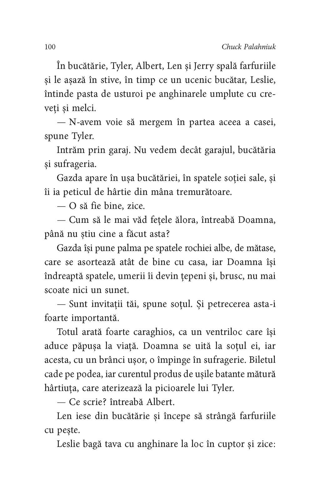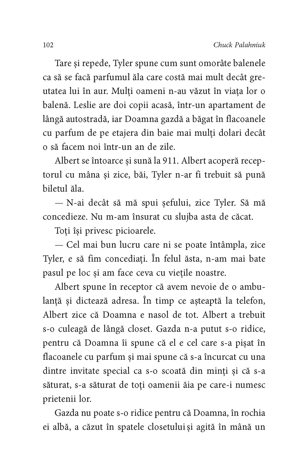 „Fiecare generaţie îşi înspăimîntă şi îşi descurajează părinţii, iar romanul lui Chuck Palahniuk este fără îndoială cel mai consistent atac al aşa-numitei Generation X.” (Booklist)